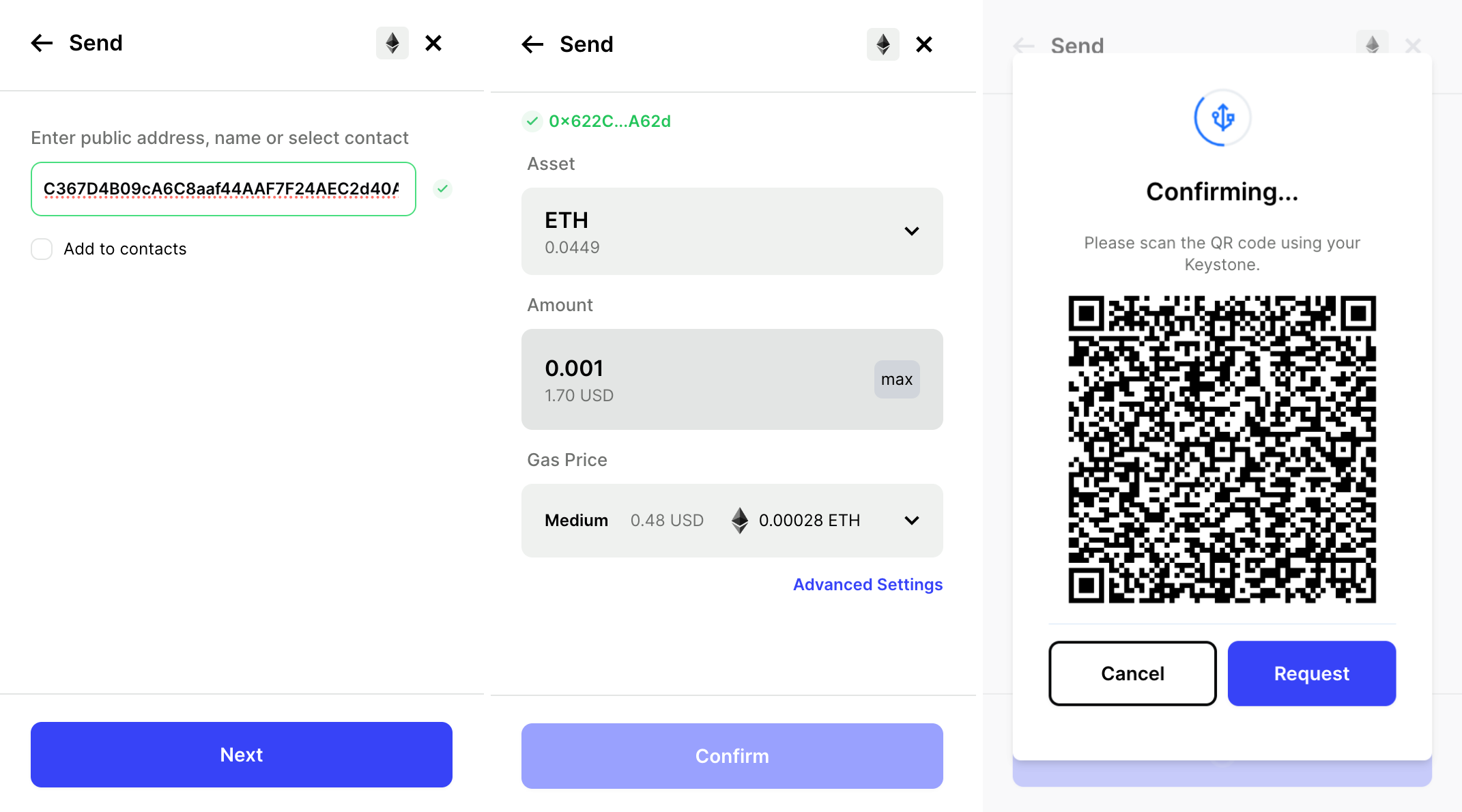Enter the recipient's address and the the amount of ETH. Confirm the transaction details.