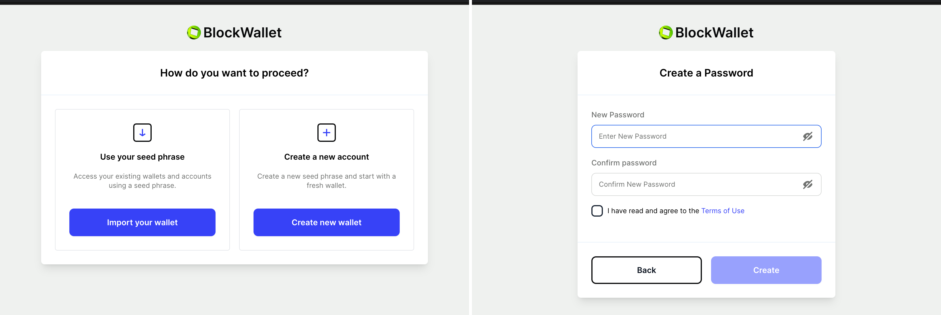 Choose [Create a new wallet] and set a strong password for your BlockWallet wallet.