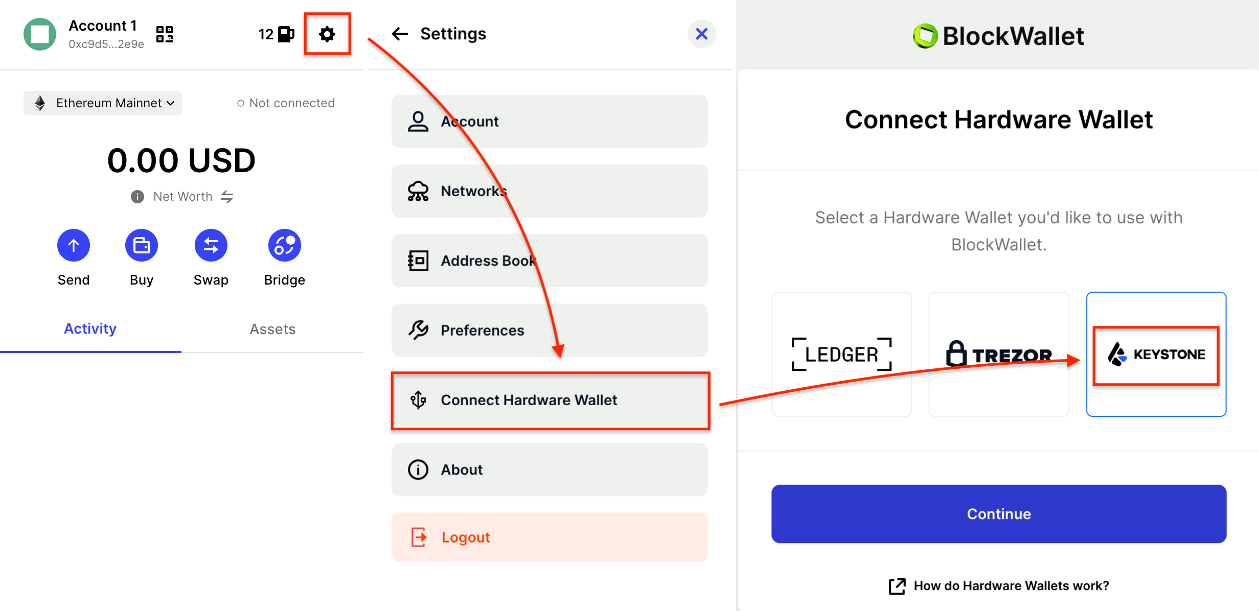 Access the BlockWallet UI. Click the [Settings] button > [Connect Hardware Wallet] > [Keystone] > [Continue].