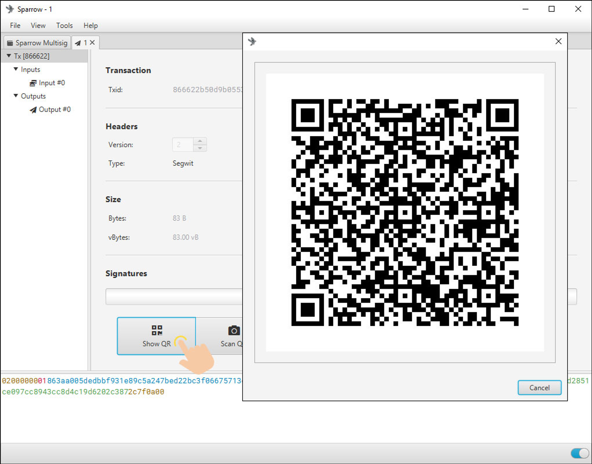 - Click on 【Show QR】, Sparrow Wallet displays the QR code format of the unsigned transaction data.