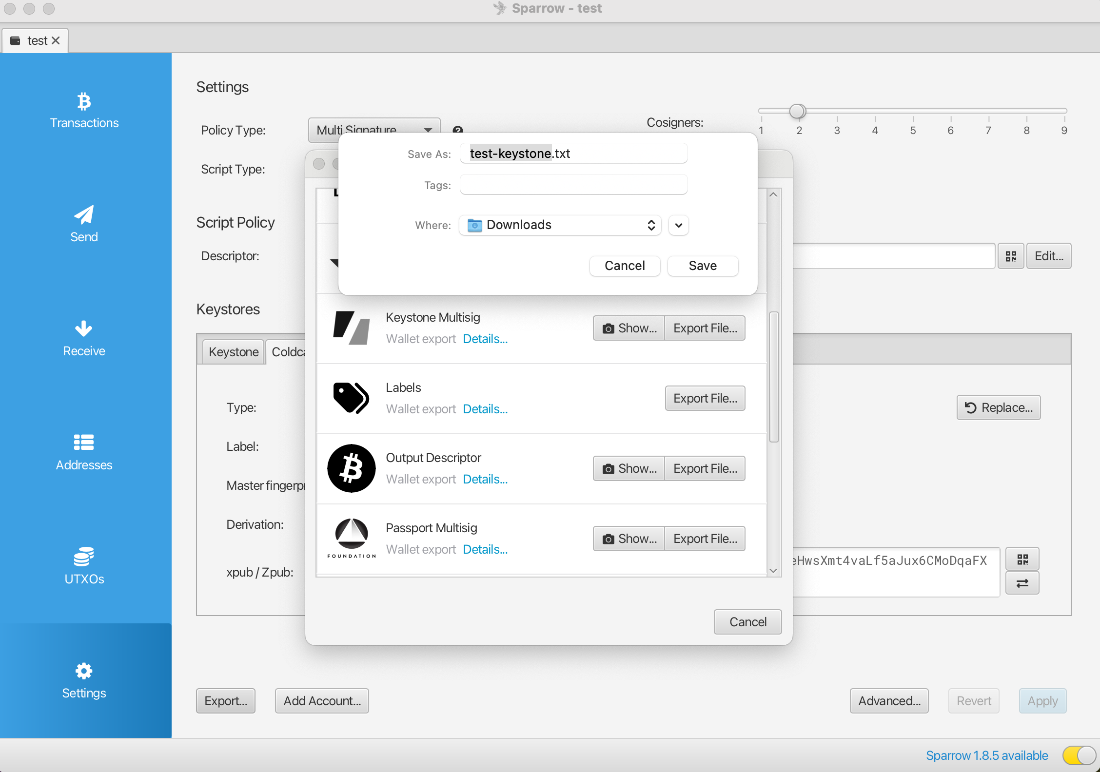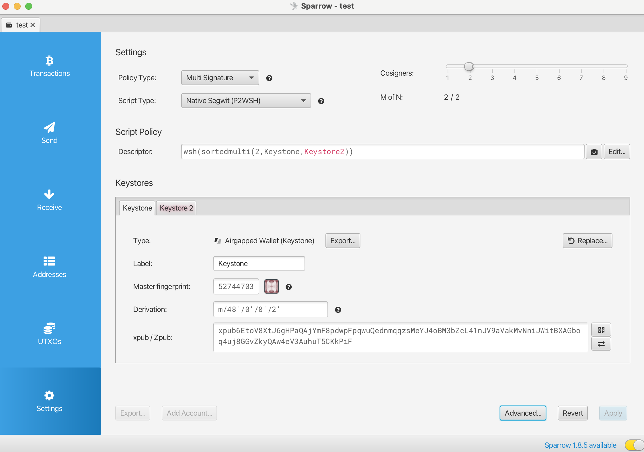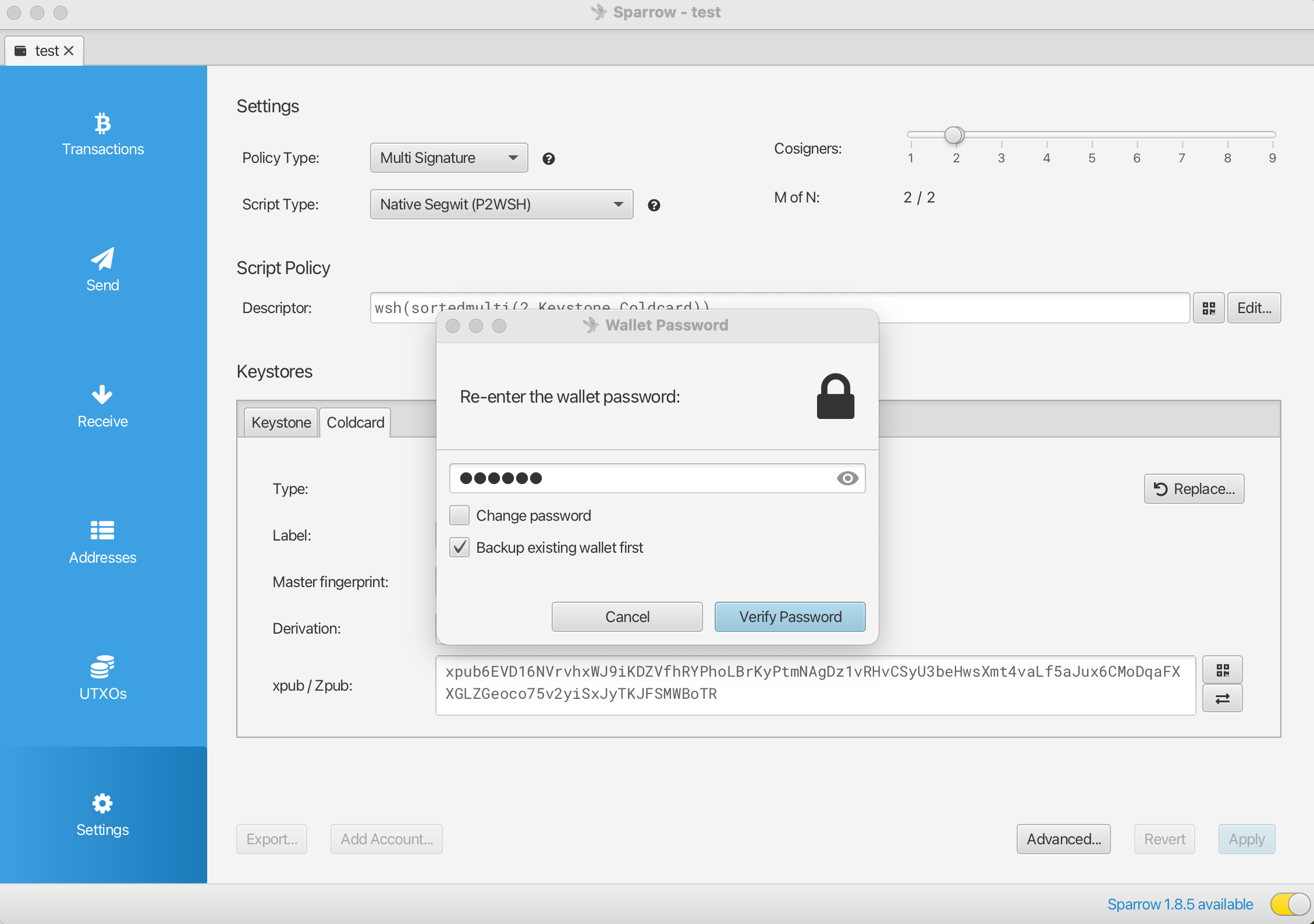 3. Create a 2/2 multi-signature wallet in Sparrow with Keystone and ColdCard as signatories: