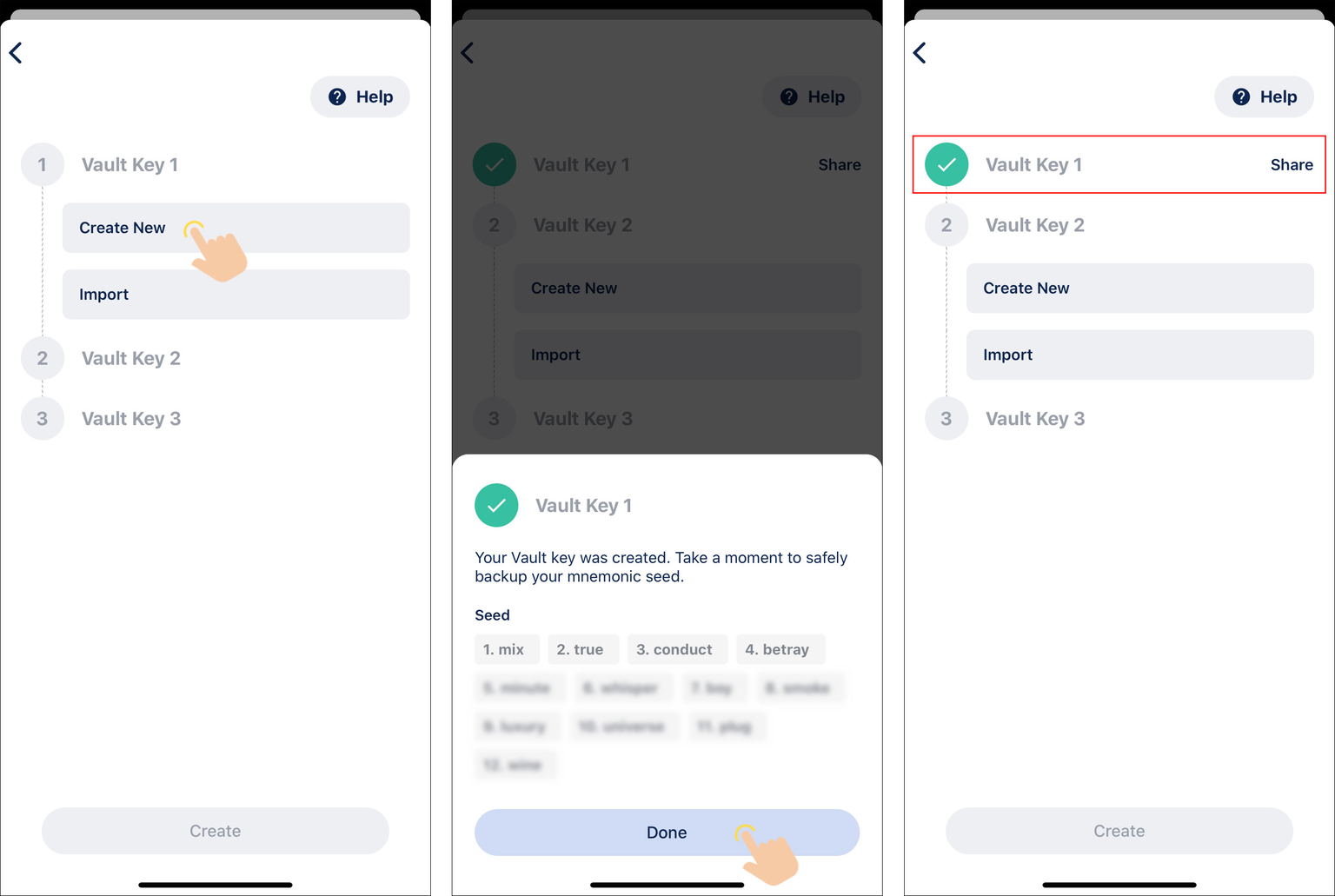 Click "Create new" under "Vault Key 1" > Securely back up the seed phrase and click [Done]. At this point, "Vault Key 1" has been automatically added by BlueWallet.