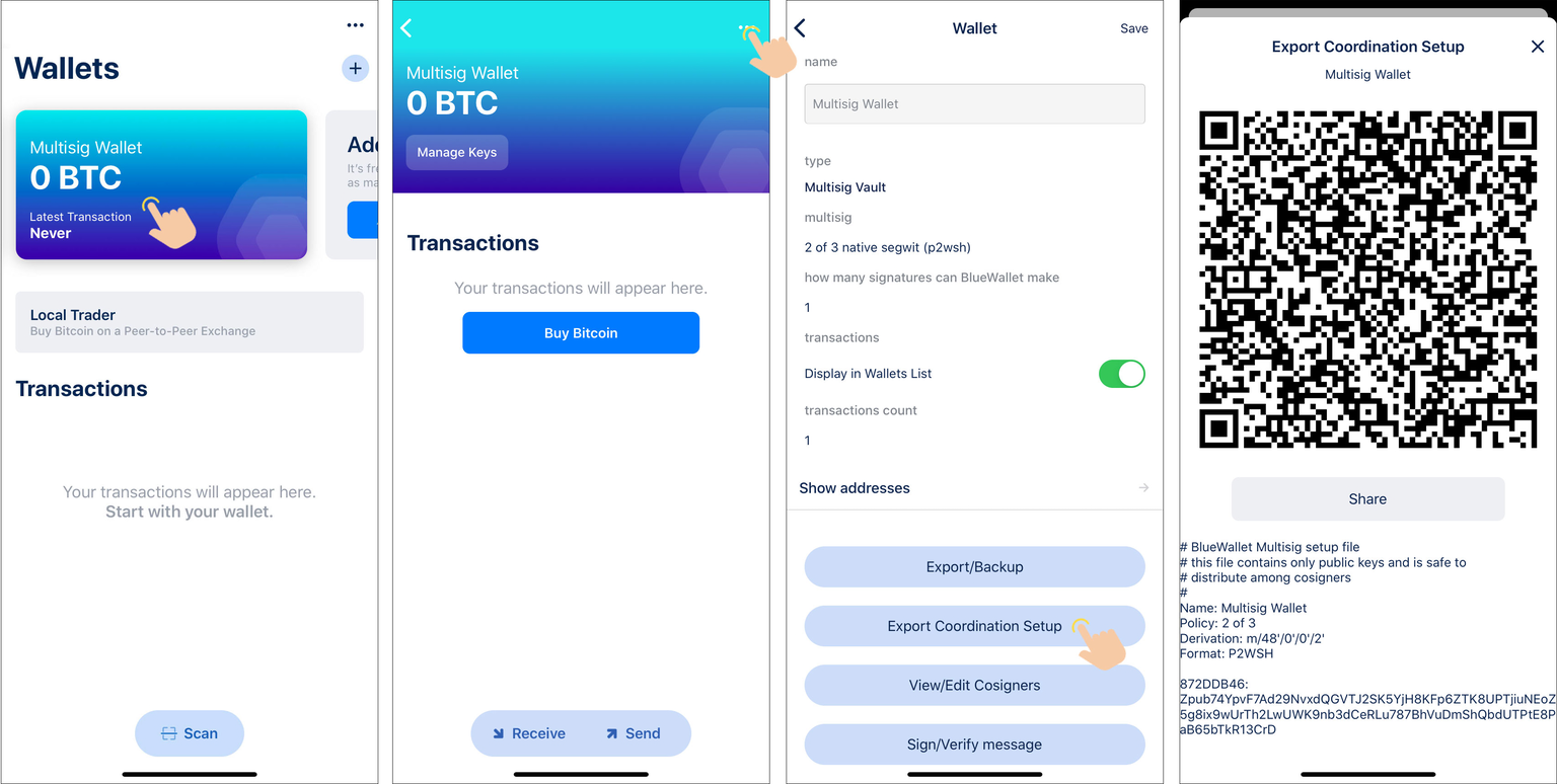 BlueWallet: Go to the corresponding wallet and select the [•••] button on the top right corner, then select the [Export Coordination Setup] option to reveal a dynamic QR code.