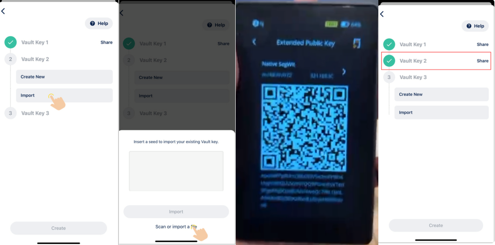 Click [Import] under "Vault Key 2" > [Scan or Import a Document] > open the camera and scan the QR code displayed by the Keystone wallet, enter the MFP next to the second address path, select the address path as (m/48'/0'/0'/2'). At this point, Keystone is imported as "Vault Key 2".