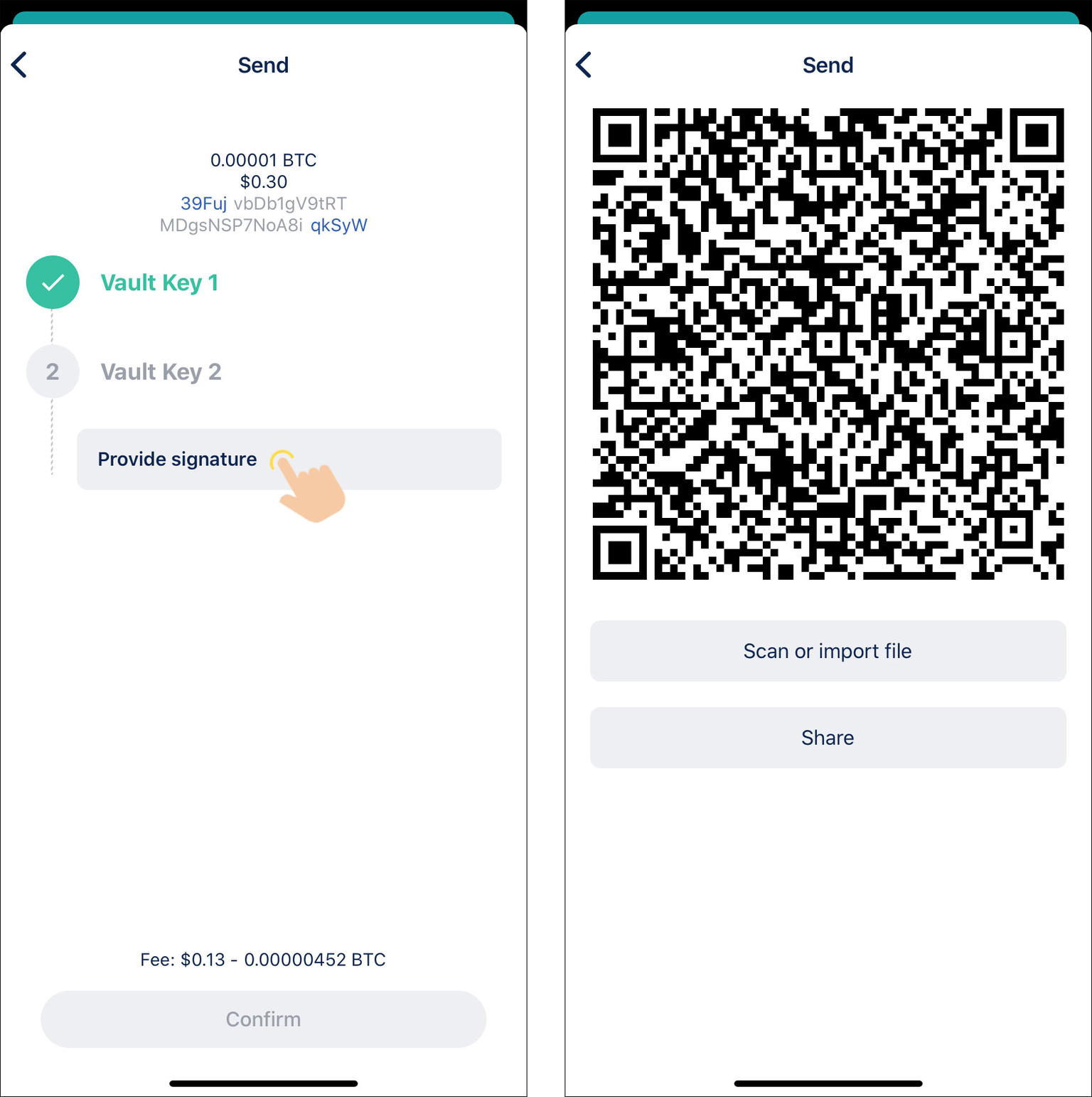 BlueWallet: Click [Vault Key 2] > [Provide signature] > BlueWallet will display the partially signed transaction data as a dynamic QR code.