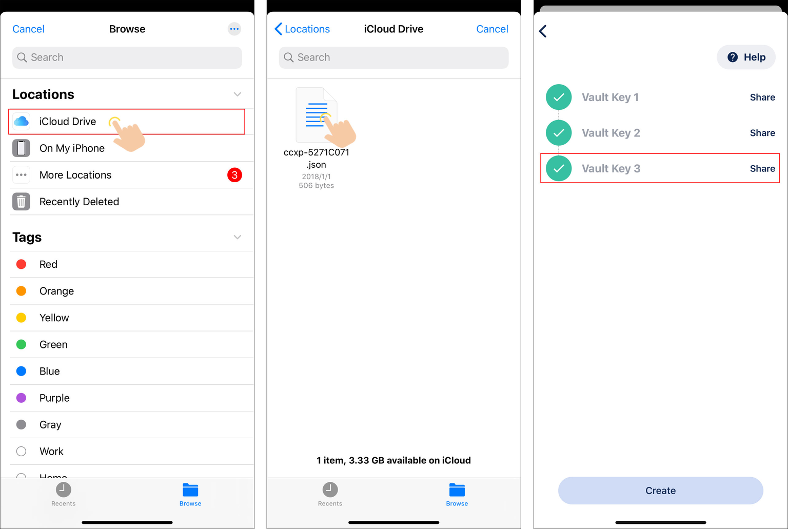 Click [Import] under "Vault Key 3" > [Scan or import a file] > click the microSD card icon at the bottom left of the page > locate and open the Coldcard's extended public key file stored in iCloud Drive. At this point, Coldcard is imported as "Vault Key 3".