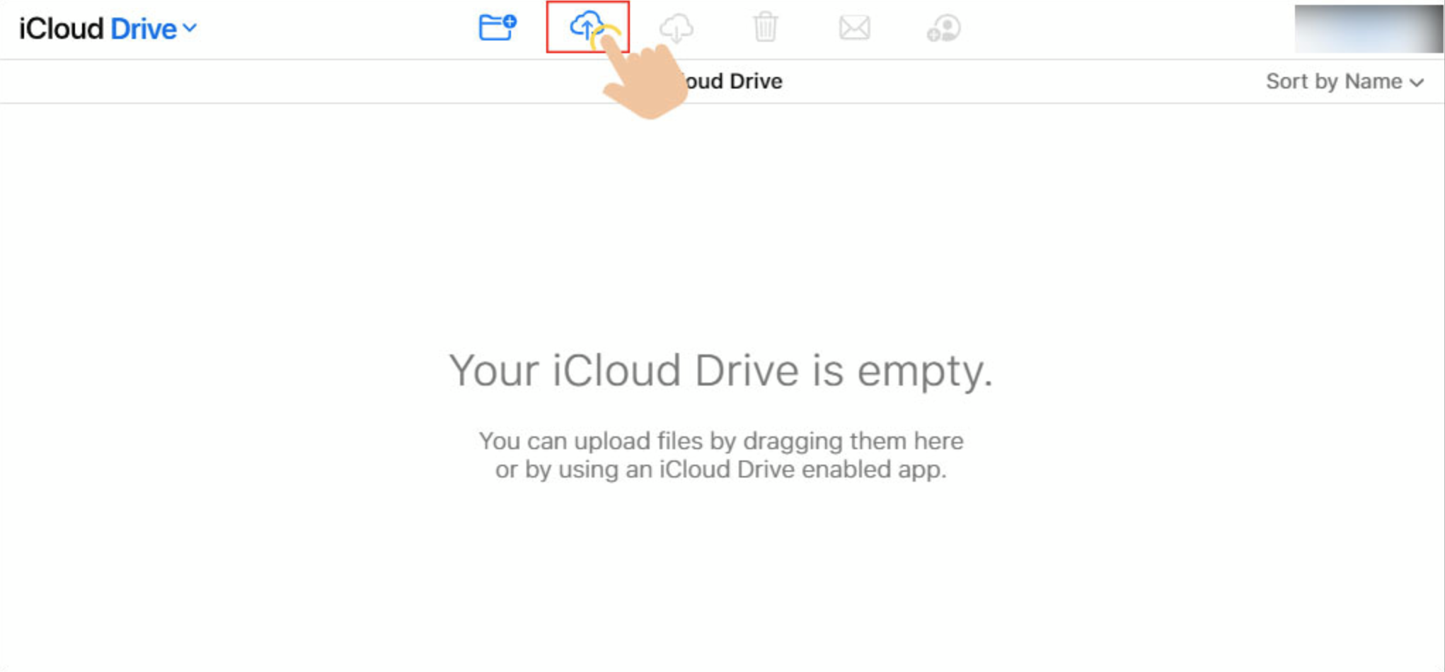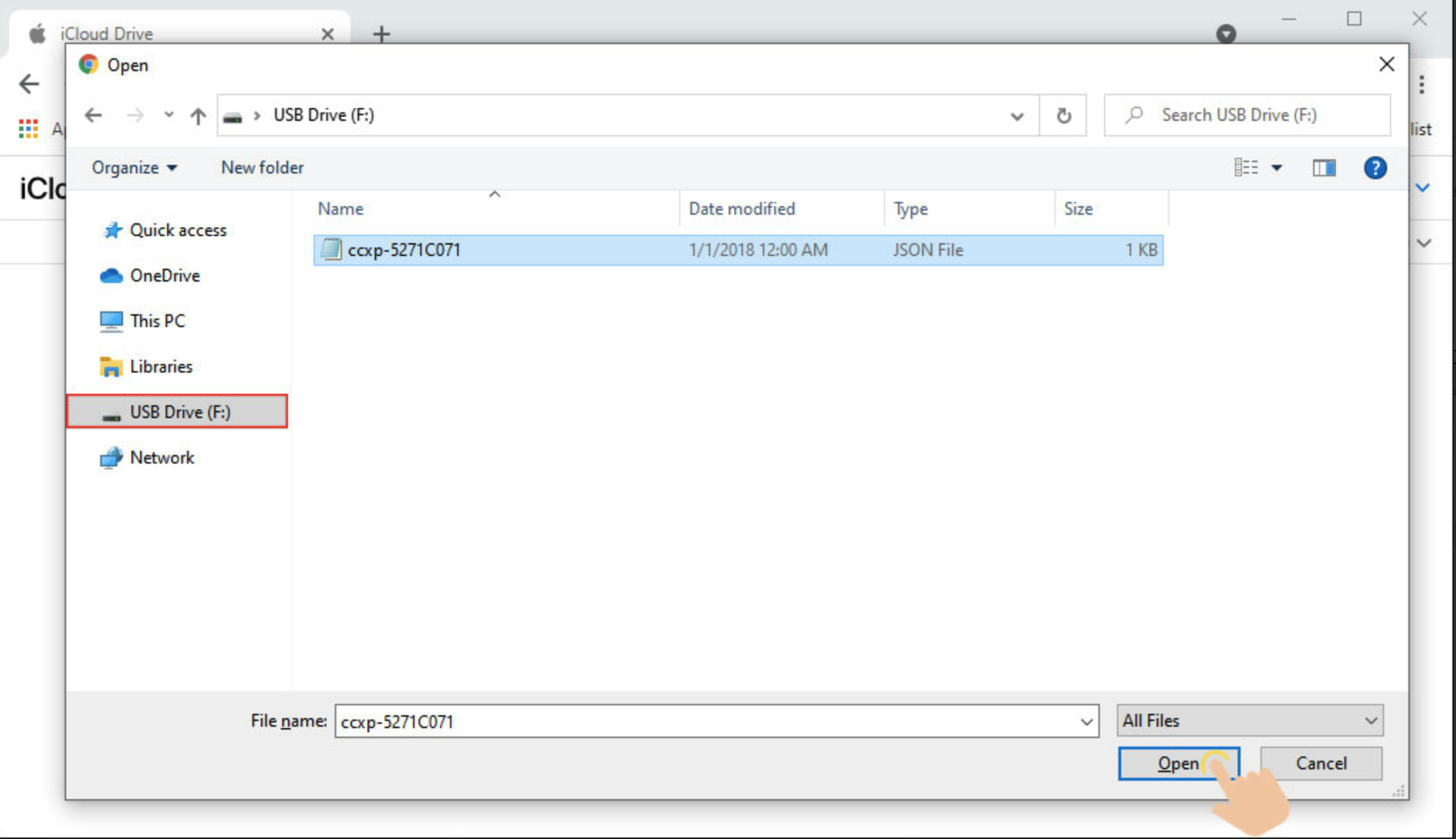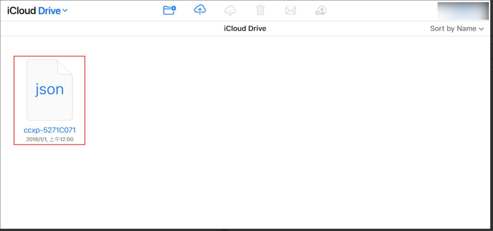 On the computer, log in to iCloud Drive, click the "Upload" icon, and upload Coldcard's extended public key document (e.g., ccxp-5271C071.json) to iCloud Drive.