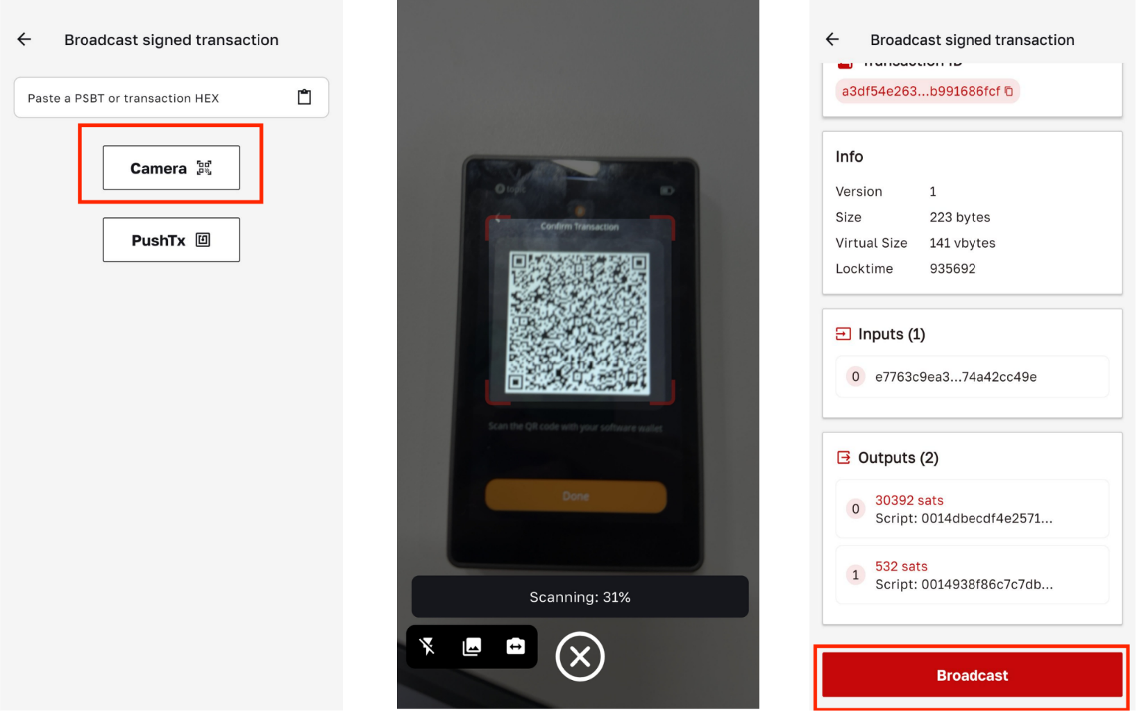 - You may now broadcast the transaction! After tapping "Broadcast", the transaction will be submitted to the Bitcoin network and the funds will be transferred. Operation Path: [Camera] → Scanning → [Broadcast]