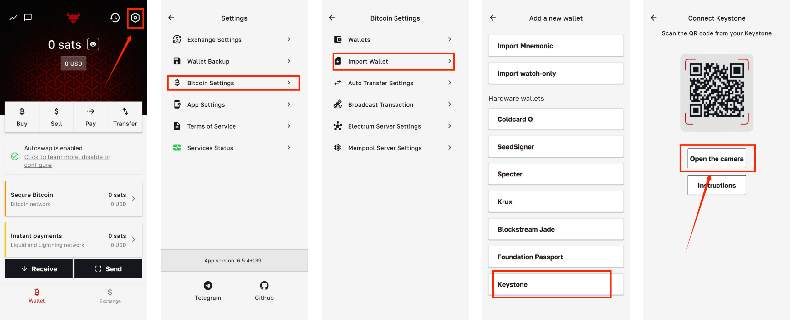 - Launch the BULL app. On the homepage, select [Settings] → [Bitcoin] → [Import Wallet] → [Keystone]→ [Open the Camera]