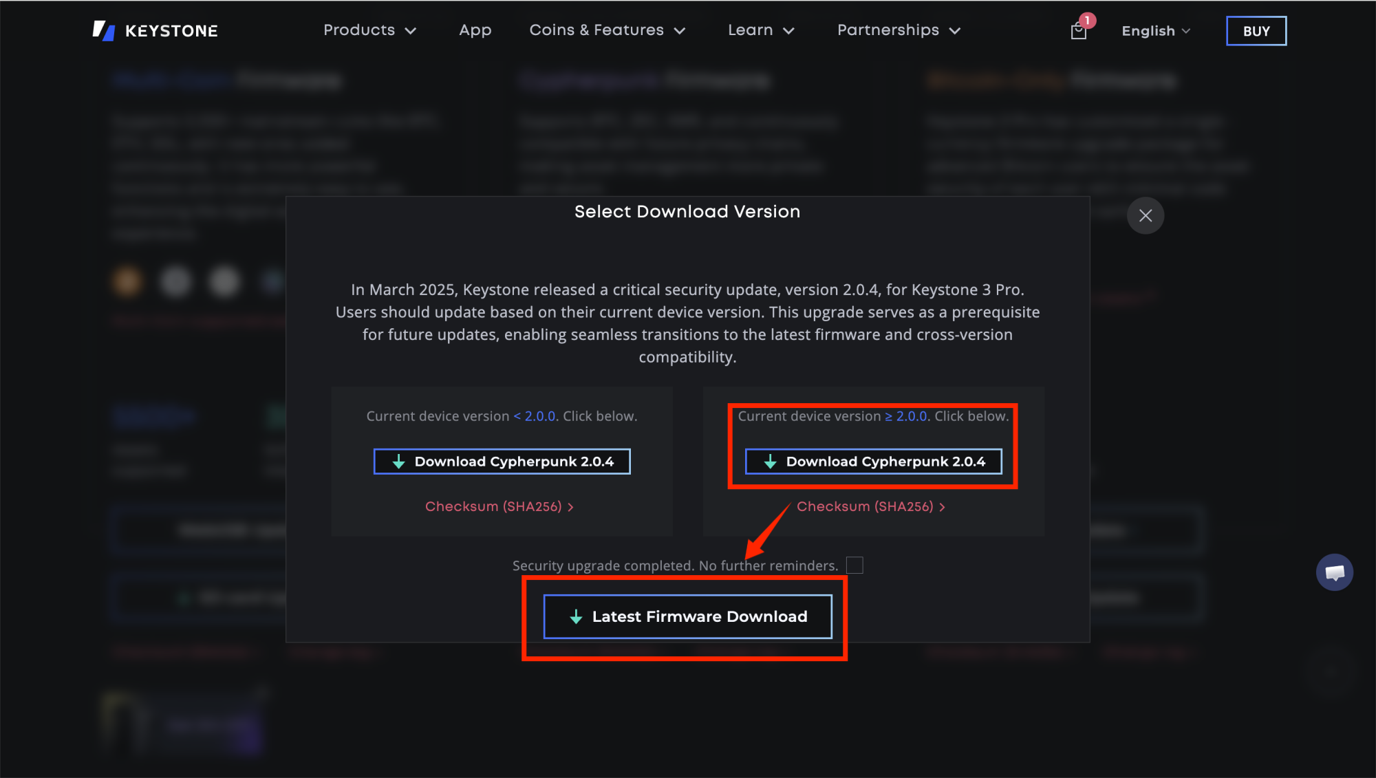 - If your current version is less than 2.0.0: Click the [Download [Corresponding Version] 2.0.4] button on the left (select based on your device type, e.g., Multi-Coin Edition, BTC Edition, etc.) to complete the security update. Then click [Latest Firmware Download] to obtain and install the latest full firmware, finishing the entire upgrade process.