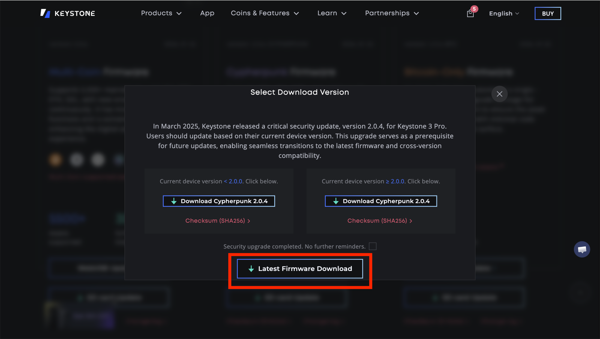 - If your current version is greater than or equal to 2.0.0 and less than 2.0.4: Click the [Download [Corresponding Version] 2.0.4] button on the right (select based on your device type, e.g., Multi-Coin Edition, BTC Edition, etc.) to complete the security update. Then click [Latest Firmware Download] to obtain and install the latest full firmware, finishing the entire upgrade process.