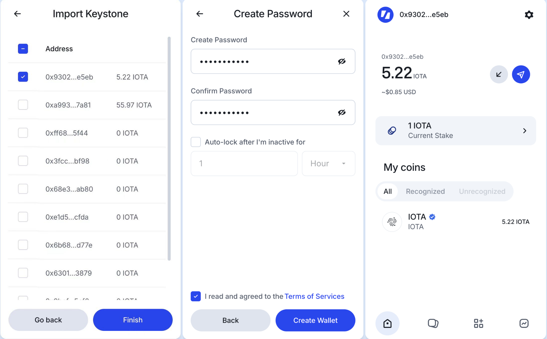 Set a password and idle auto-lock time for managing your IOTA wallet. Once completed, click [Create Wallet] to finish setup and enter the homepage.