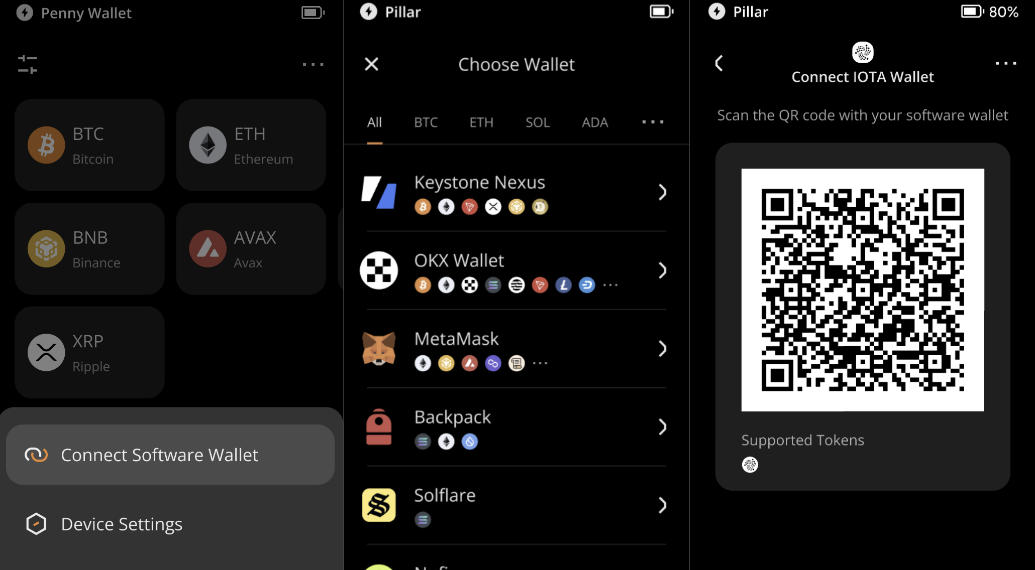 Open your Keystone device, tap the top-right corner [···] > [Connect Software Wallet], find [IOTA Wallet], and a dynamic QR code for connecting the wallet will appear on your device.