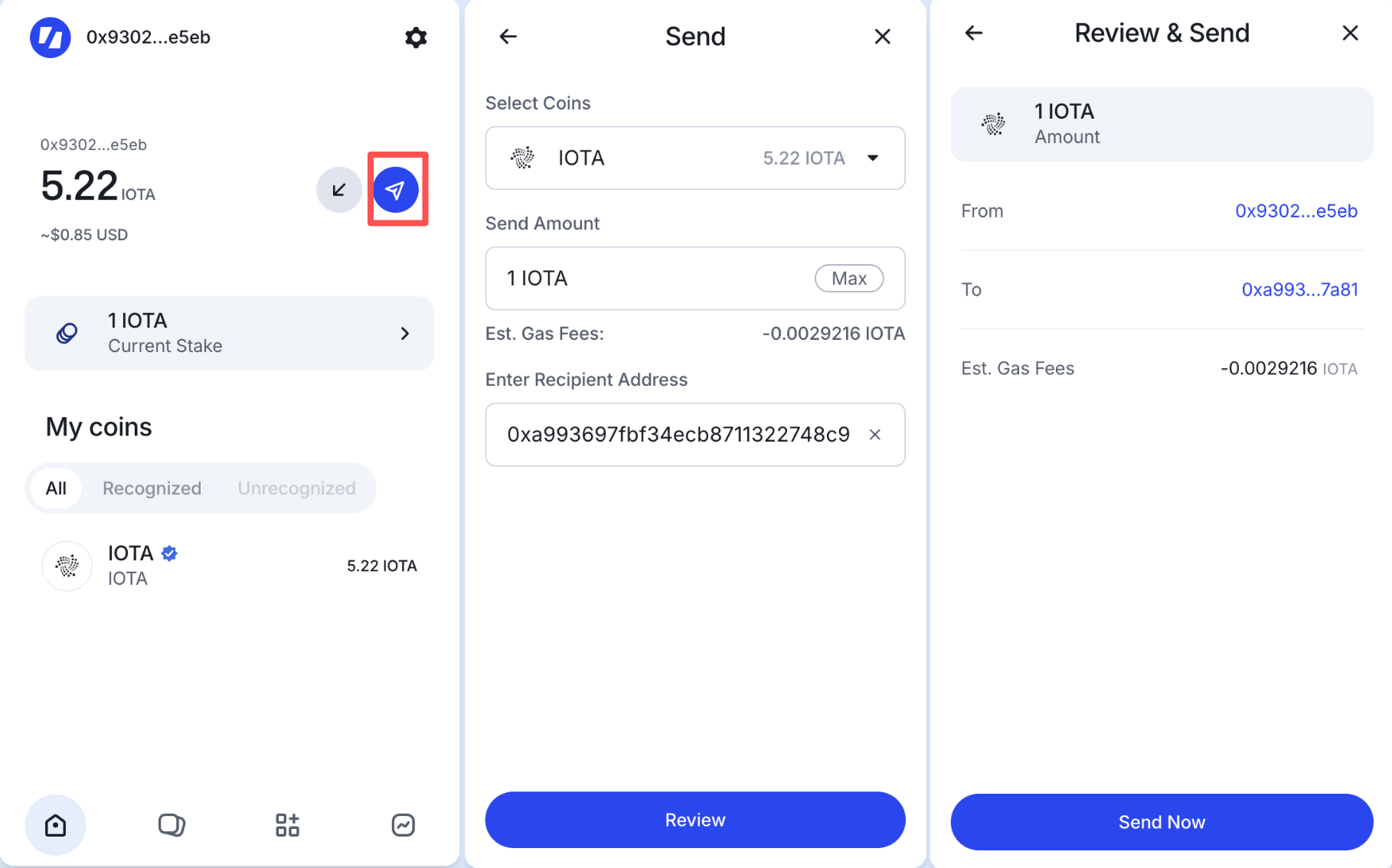 On the Send page, enter the amount and recipient address, then click [Review].