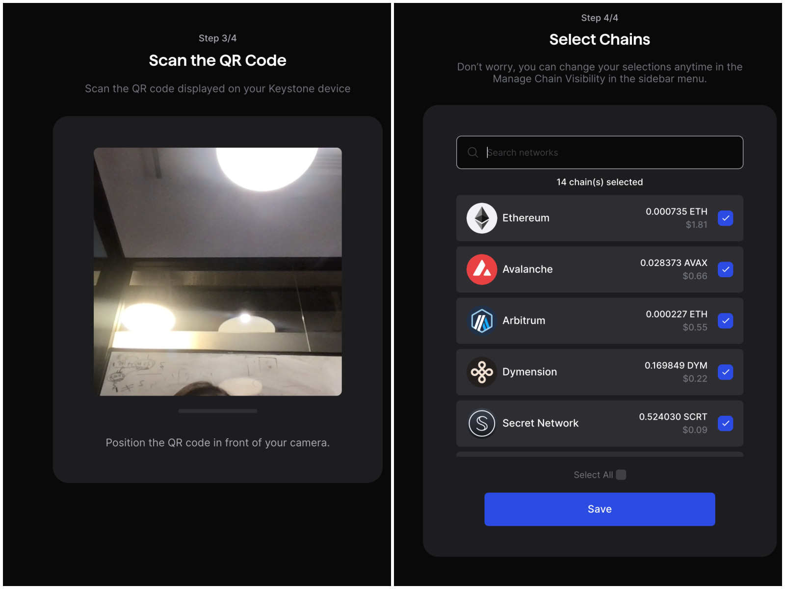 Select the desired chains and assets, then click “Save.”