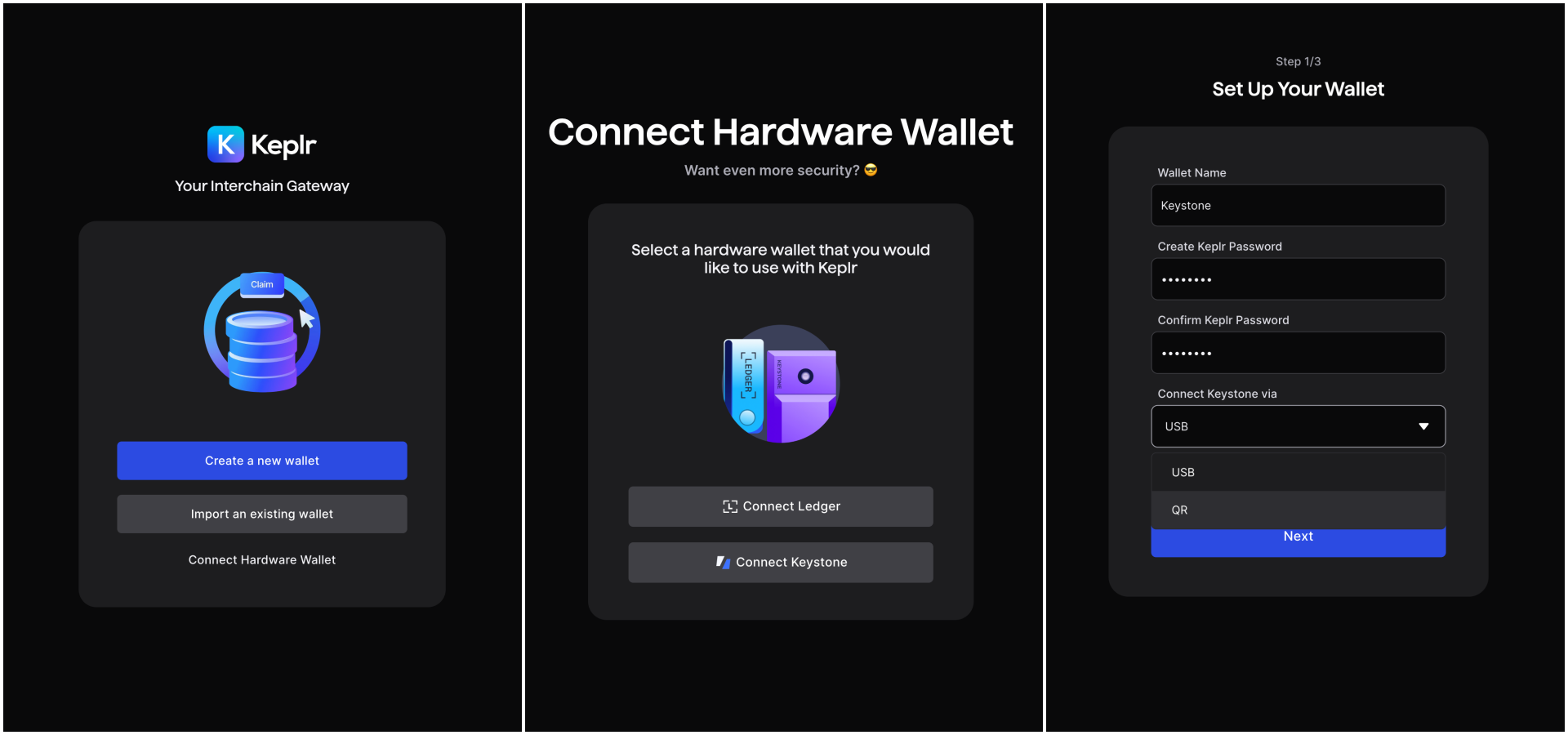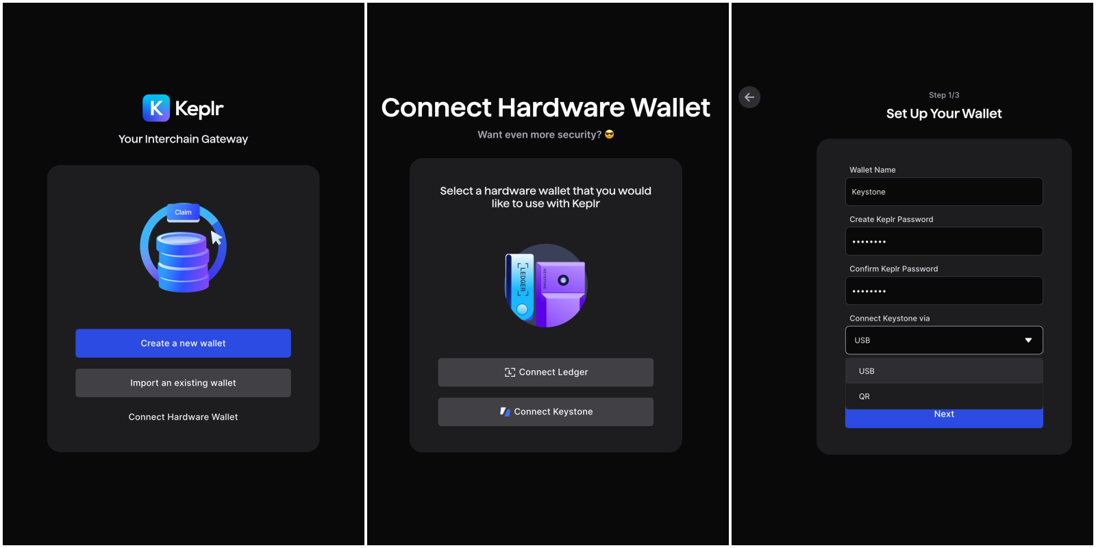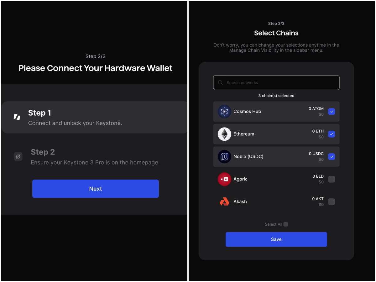 Launch the Keplr Extension and select”Connect Hardware Wallet” and “Connect Keystone”.