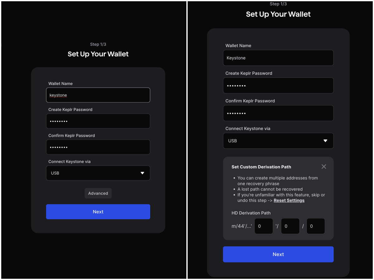 For advanced users,click “Advanced” to customize the derivation path when selecting USB as the connection method.