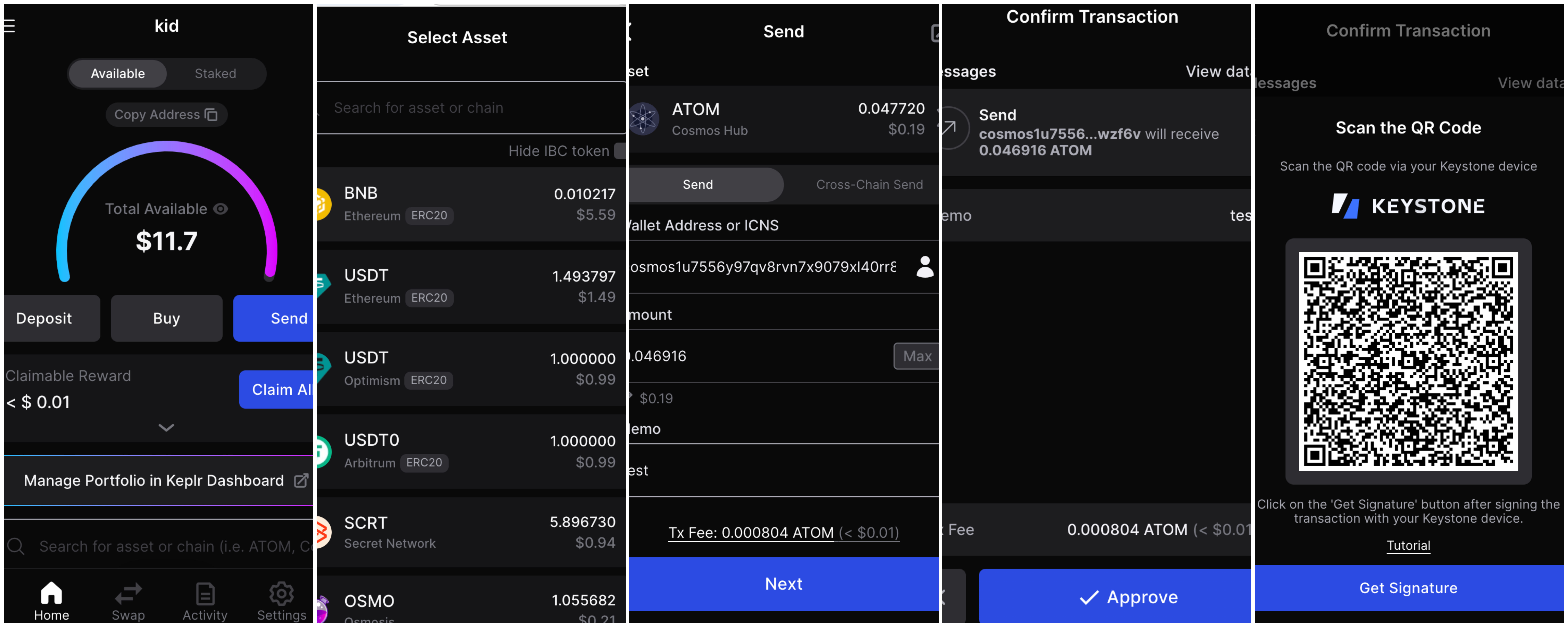 - Return to Keplr Extension, click "Get Signature" and scan the QR code generated by the Keystone page to complete the transaction.