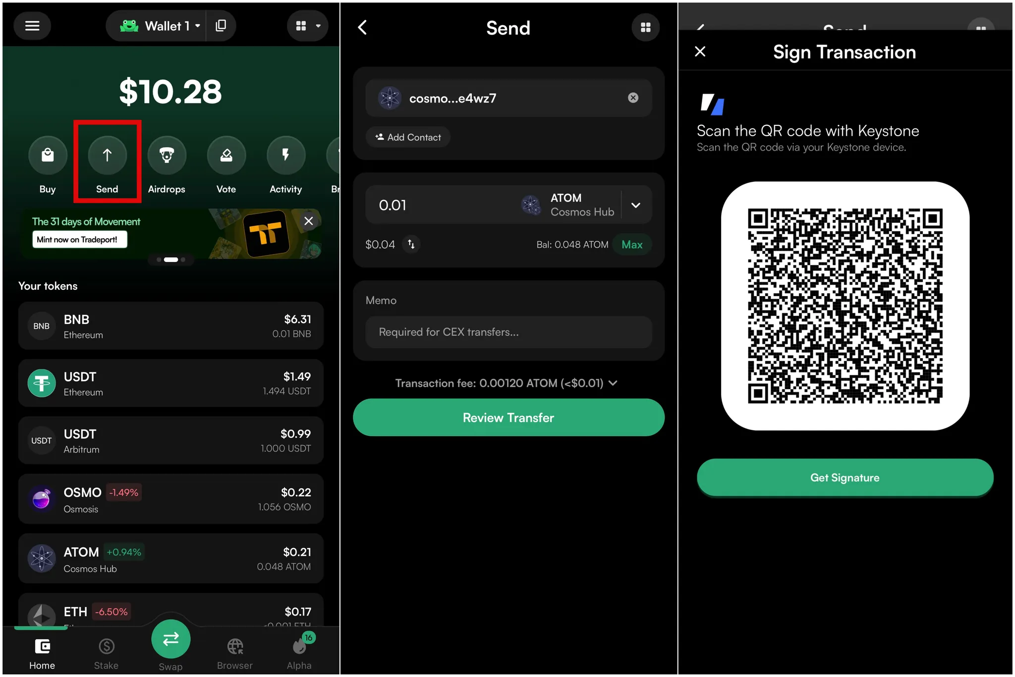 Tap [Get Signature] on Leap Wallet, then scan the QR code shown on your Keystone to complete the transaction.