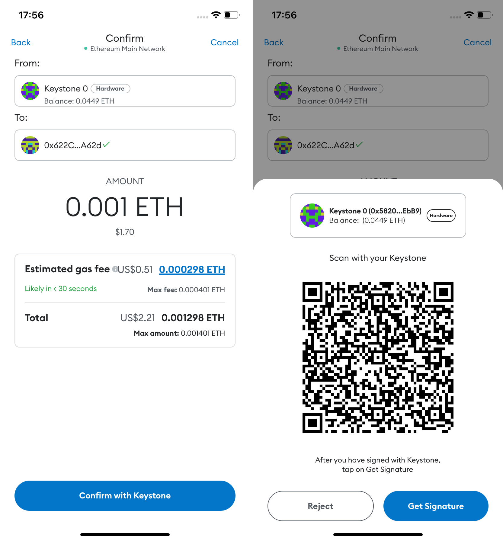 Keystone, as a hardware wallet, secures your assets, and all transactions after binding require Keystone's signature. Plus, you can explore and use various online features in MetaMask to meet your basic needs.