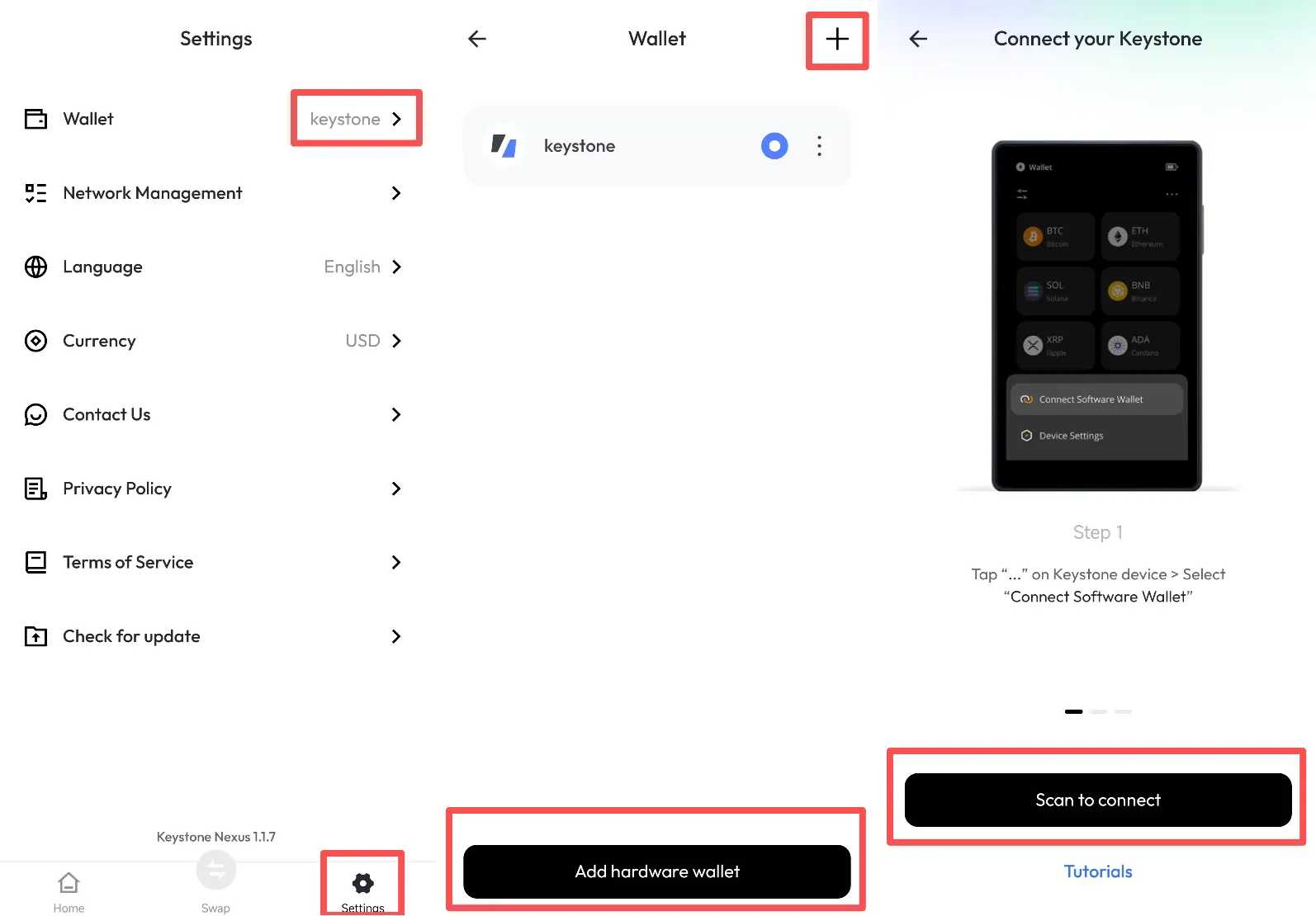 You can refer to this guide to connect to Nexus. The QR code on the Keystone hardware wallet used to connect to Keystone Nexus only contains public key information and device identifiers for establishing the connection, like any 3rd party software wallet we have integrated. This information does not involve and cannot derive your private key. Your wallet‘s private keys always remain securely stored within the hardware wallet and are never sent through the QR code or online, so they will never be exposed.