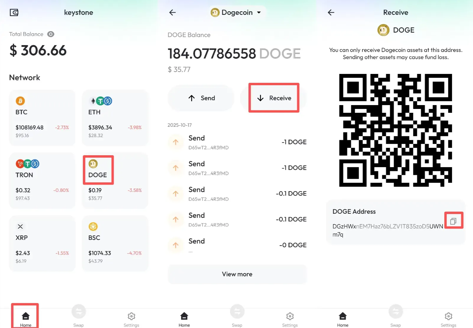 On the homepage > select the cryptocurrency you want to receive > click [Receive]. You can view the QR code for the address or tap the icon below to copy the address directly.