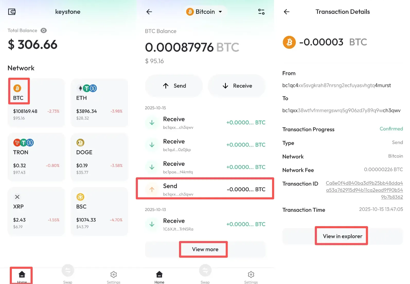 On the homepage > select the network you want to view (e.g., BTC) > scroll down and click [View more] to see full transaction history .