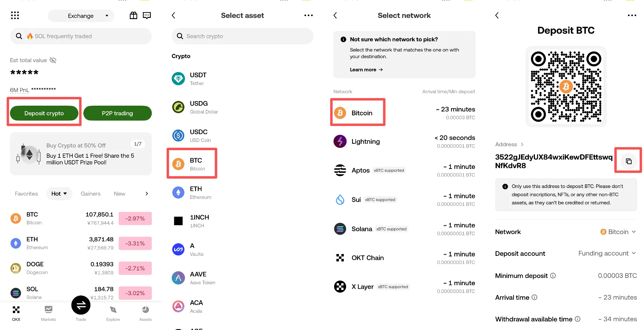 Go to [Deposit crypto] > select the cryptocurrency [BTC] > choose the network [Bitcoin] > use the QR code or copy the exchange’s receiving address.