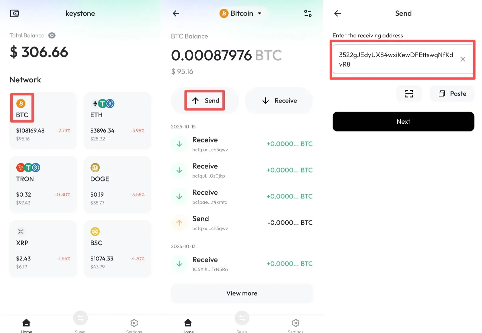 Select [BTC] > click [Send] > enter your exchange’s receiving address or scan the QR code.