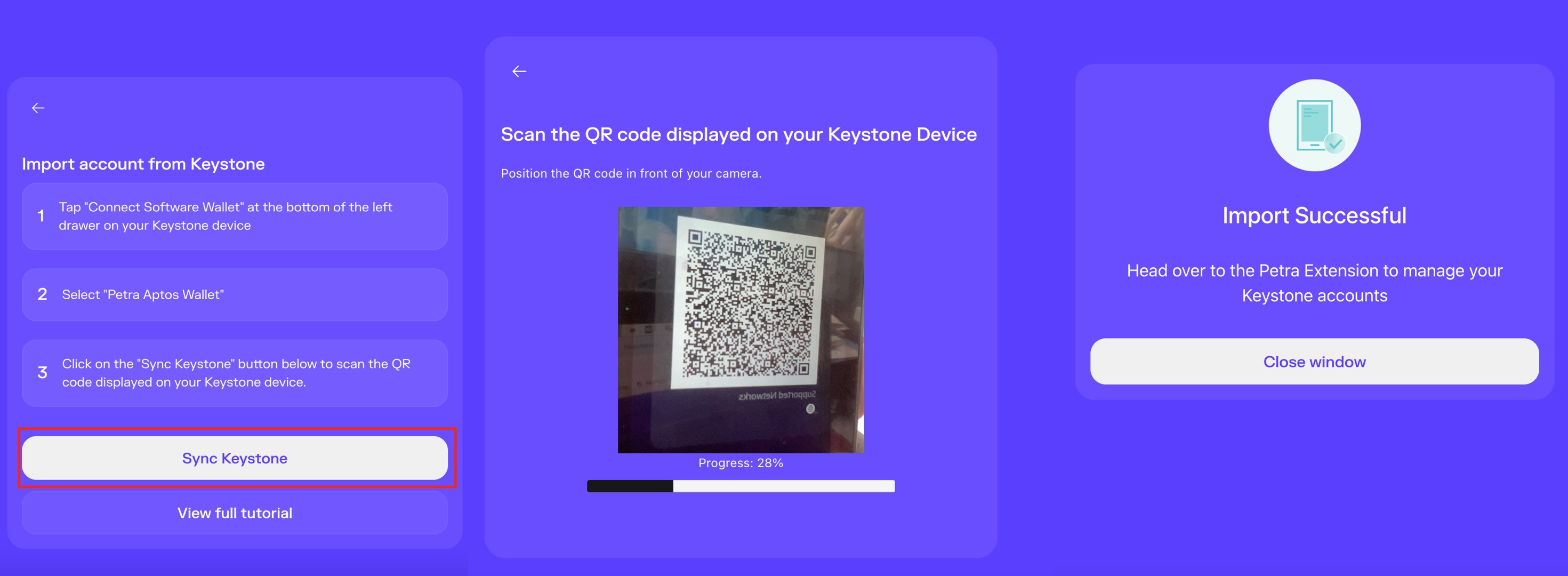 - Select "Add Account" → "Import from Keystone" → "Sync Keystone", then scan the QR code displayed on your Keystone device. Wait for the dynamic QR code to be recognized by the Petra extension (no progress bar is shown; this may take approximately 5-30 seconds).