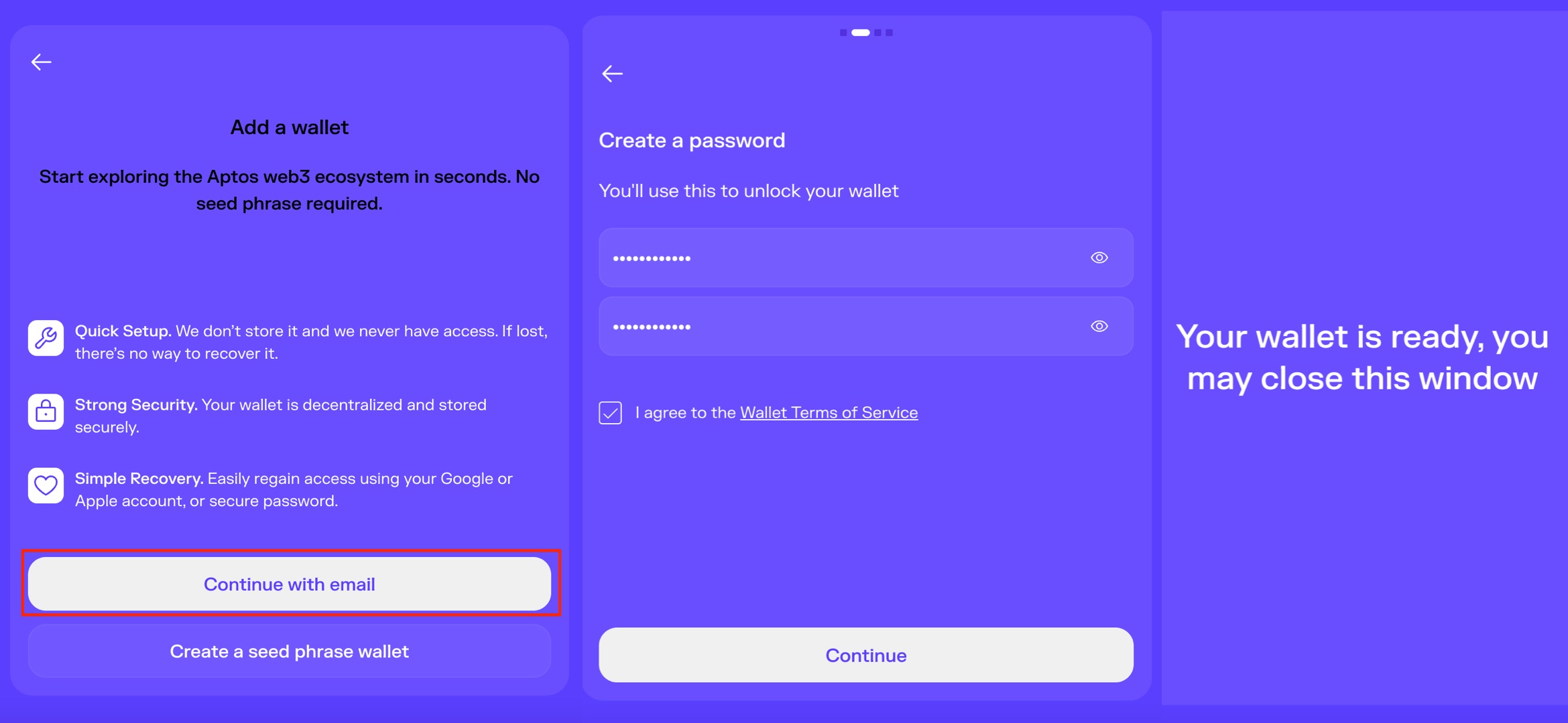 Select "continue with email" to register via email - enter your password - account creation successful! After successful creation, you may close the window and open the Petra extension for use.