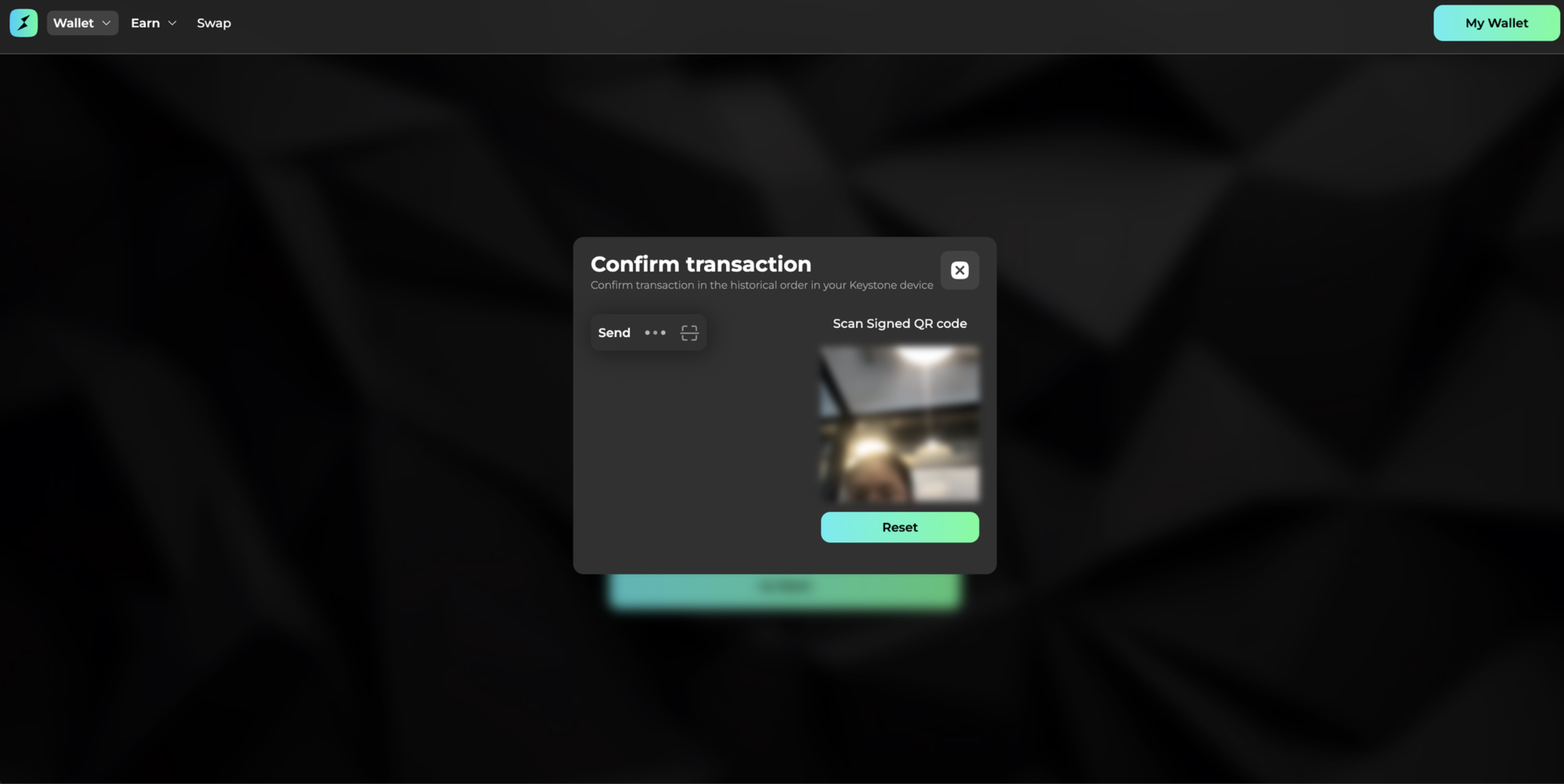 Return to the THORWallet page. The website will now display a scan page. Use the computer’s camera to scan the QR code generated by the Keystone page to complete the transaction.