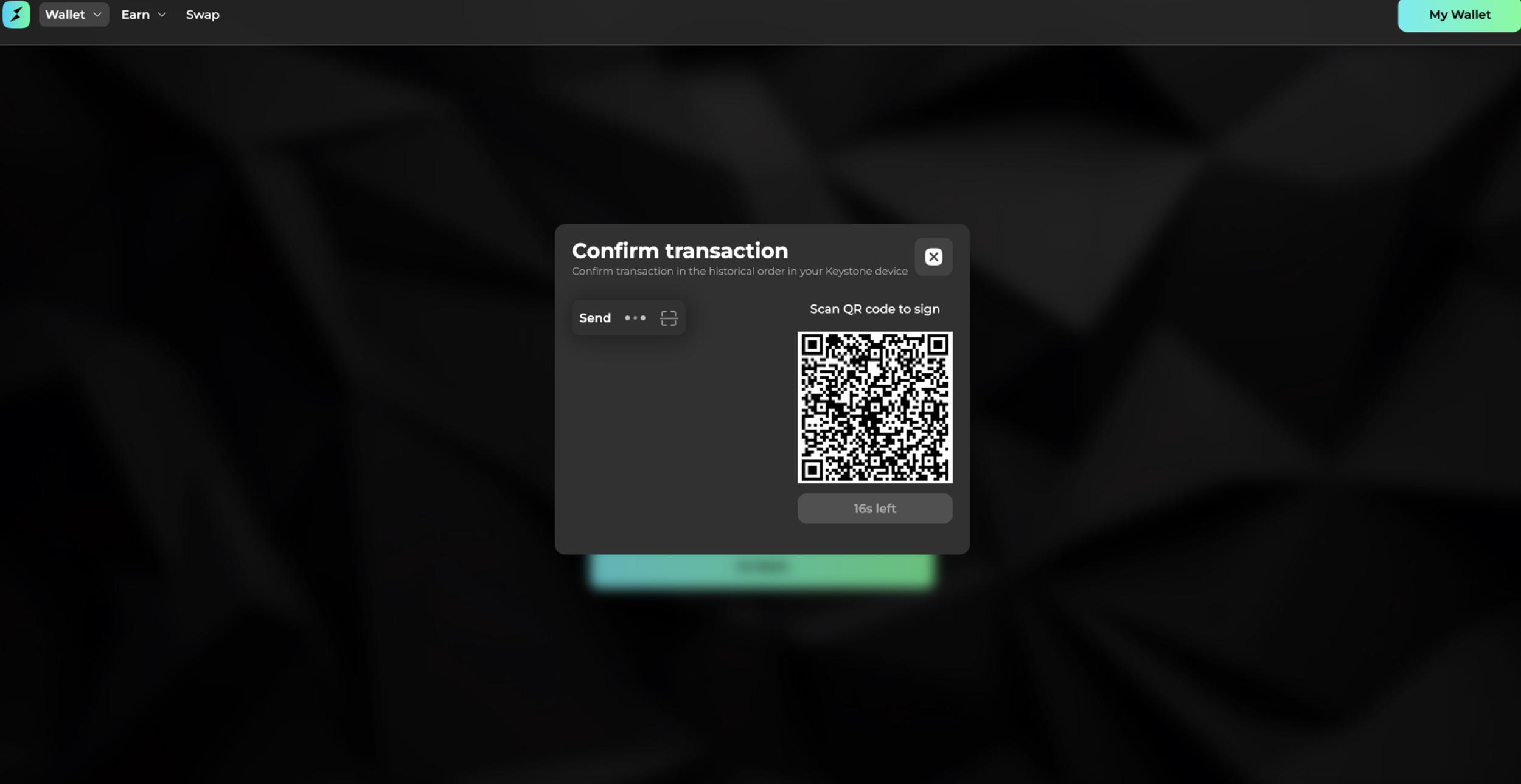 Scan the QR code displayed on the THORWallet page requesting the signature > Confirm the transaction information > [Swipe to confirm] > Enter your password > The Keystone hardware wallet will display another QR code.