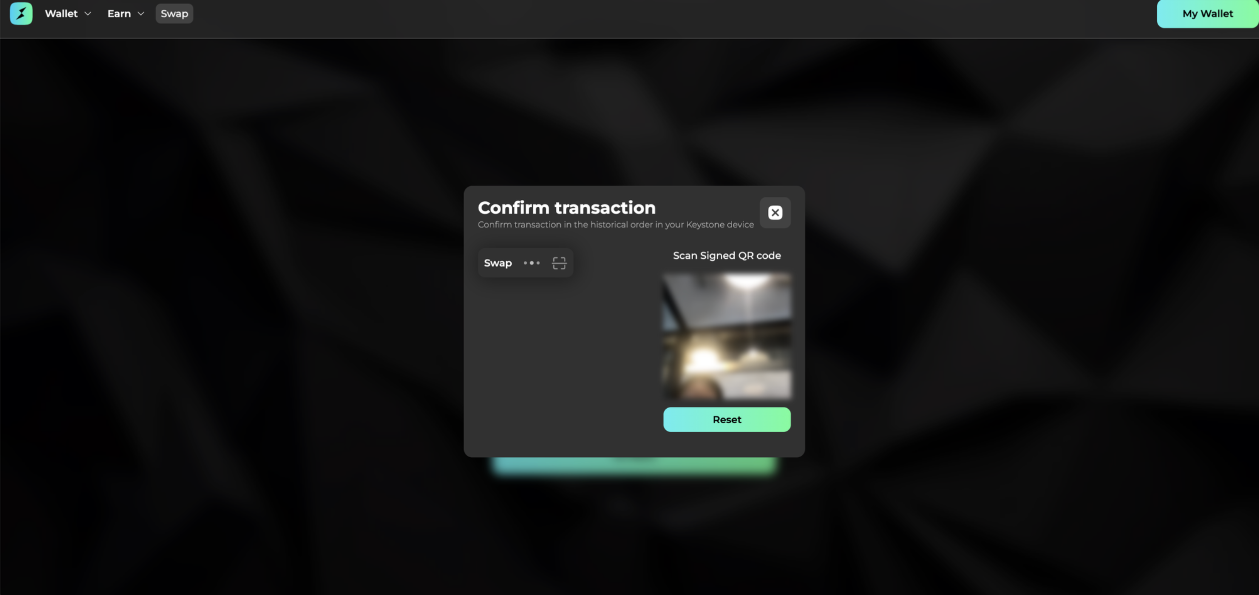 Scan the QR code displayed on the THORWallet page requesting the signature > Confirm the transaction information > [Swipe to confirm] > The Keystone hardware wallet will display another QR code.