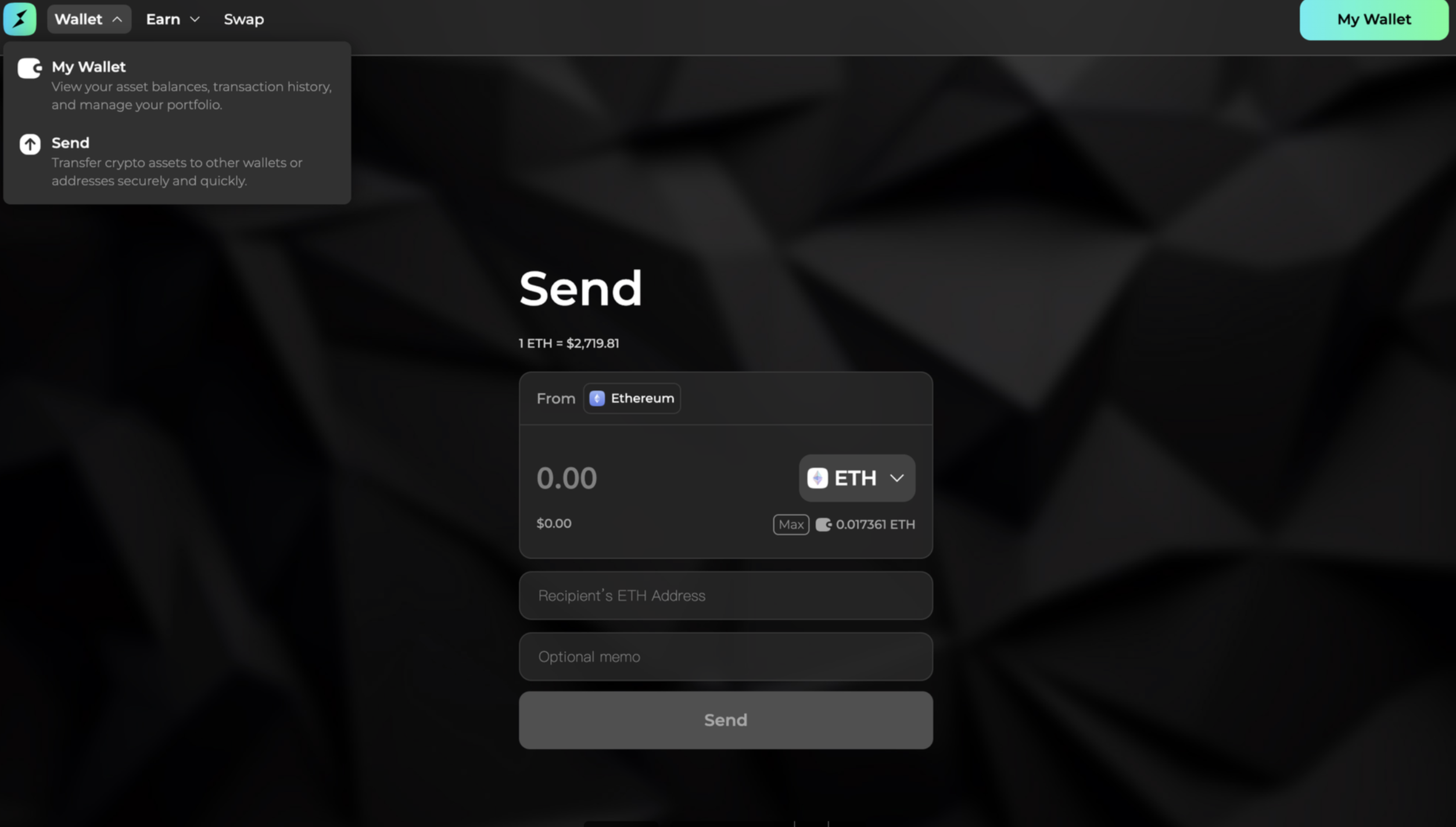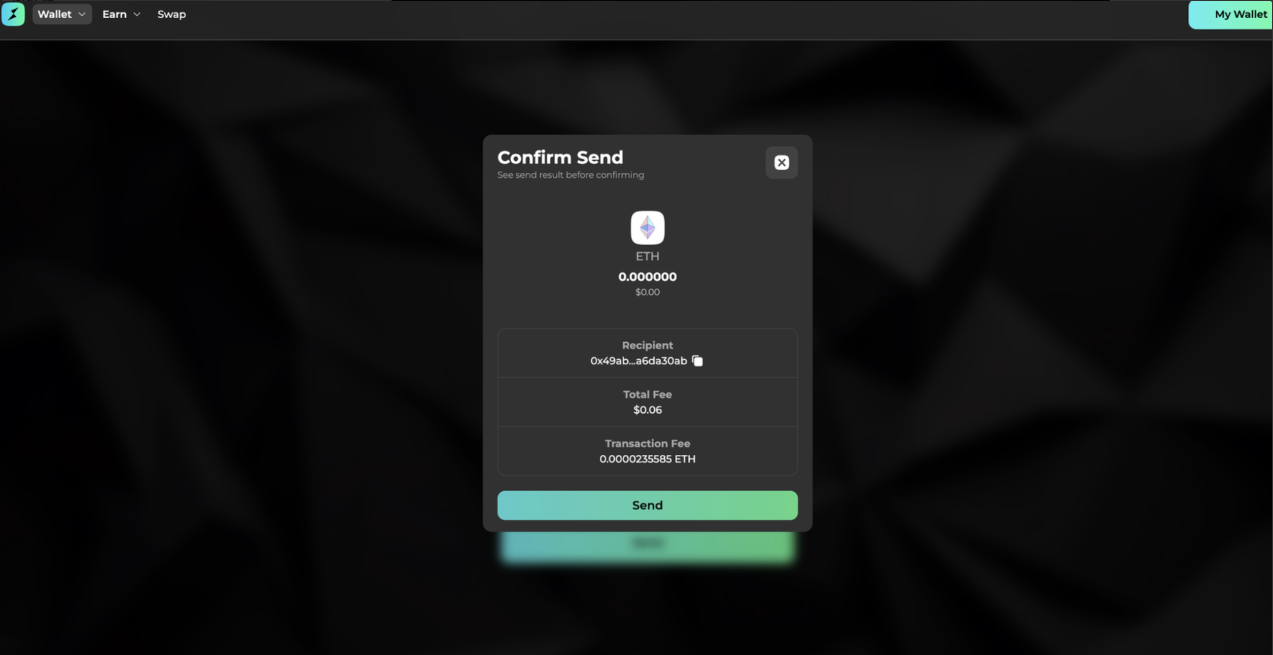 Click on the top left "Wallet" > Click "Send" > Enter the recipient's address > Click "Send" to confirm the recipient's information > Send