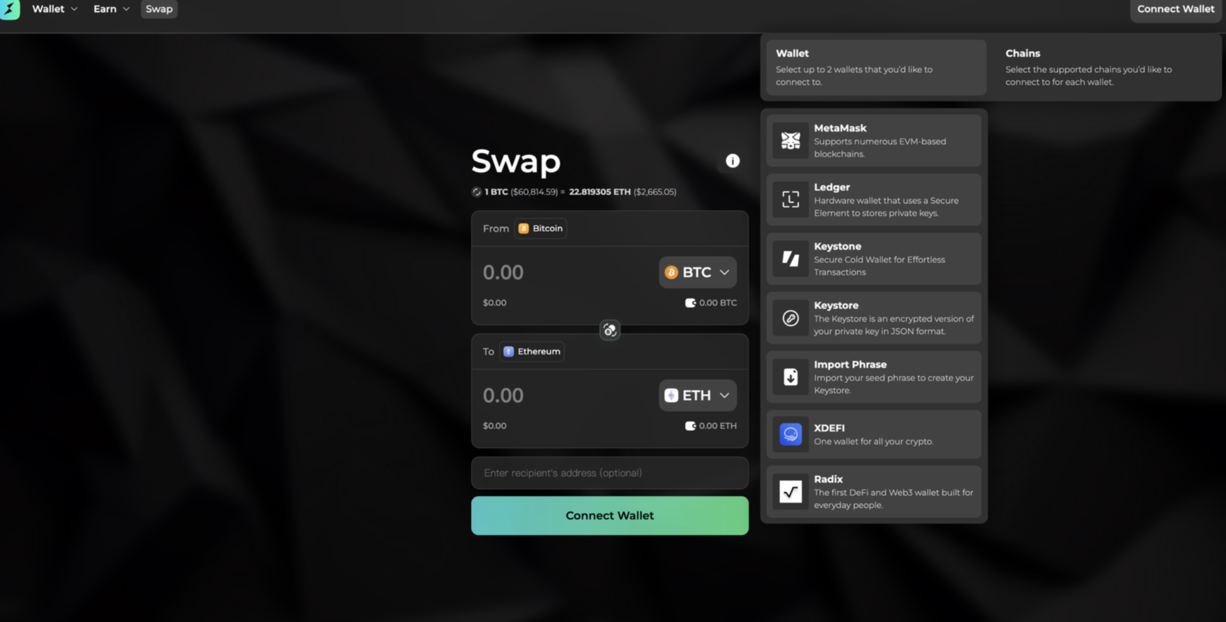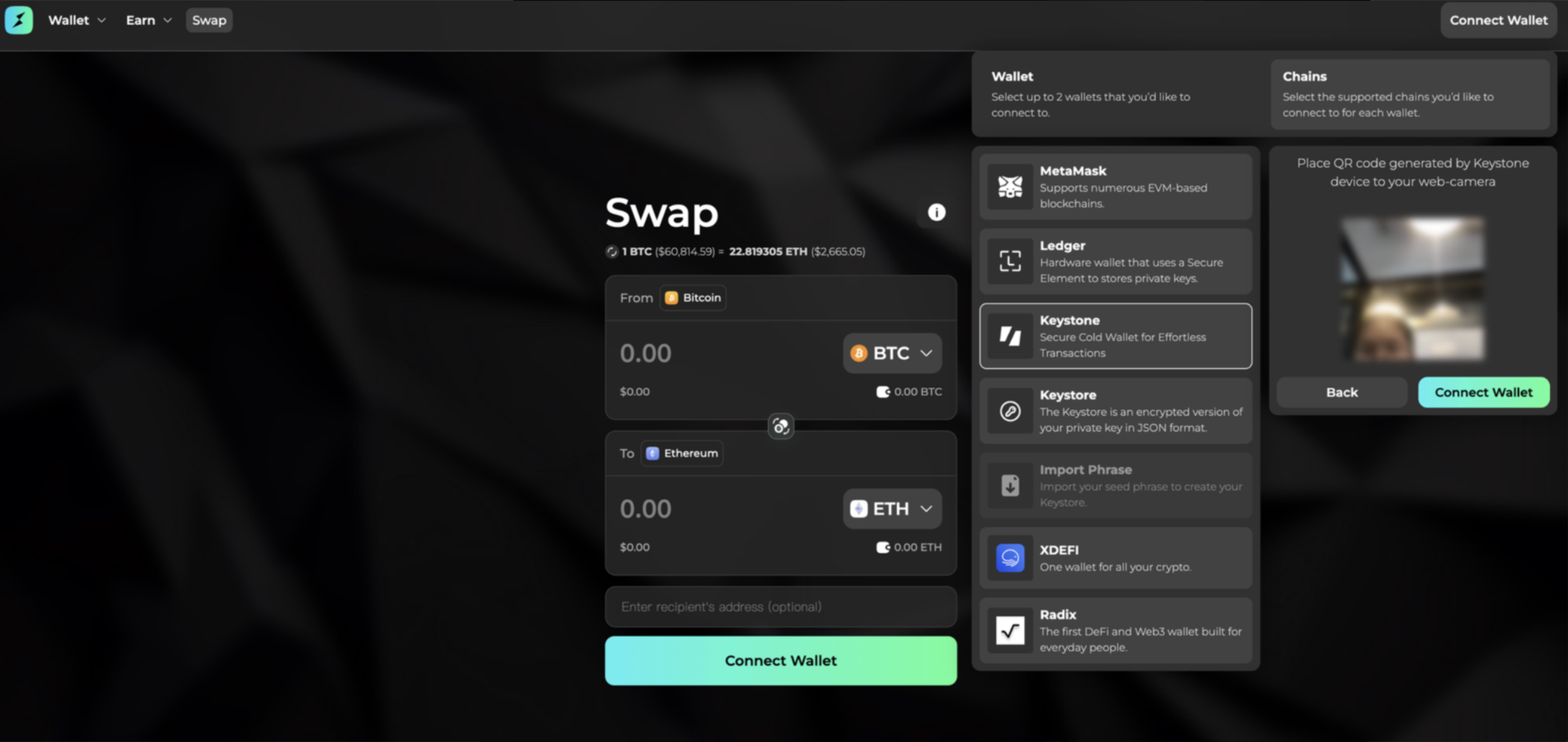 Click "Connect Wallet," choose "Keystone" to connect, and select the transaction chains for your wallet (the system defaults to RUNE and ETH).