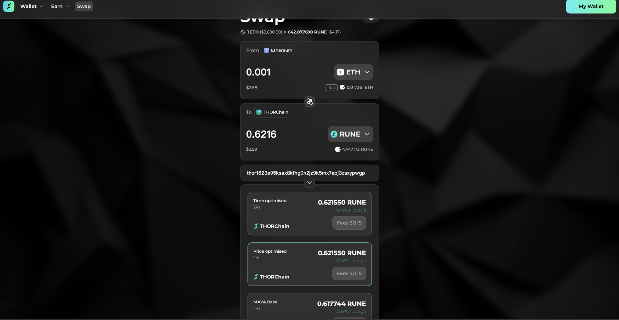 On the THORWallet page, click "Swap" > Select the asset pair you want to exchange, such as RUNE and ETH > Enter the amount of assets you want to swap > Enter the recipient address