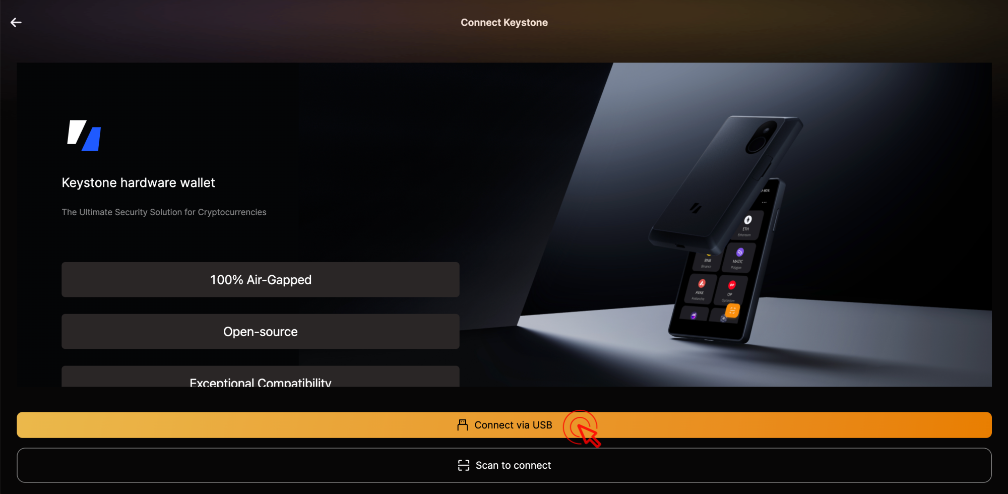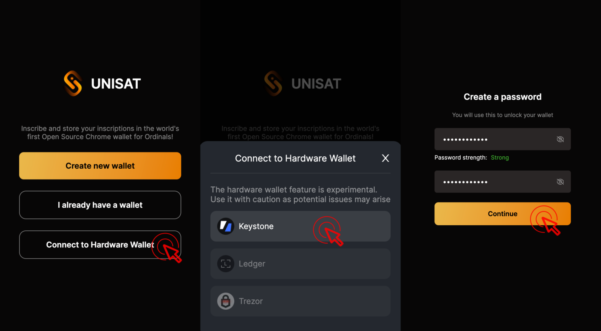 Click [Connnect to Hardware Wallet] > [Keystone]. Create password and click [Continue].