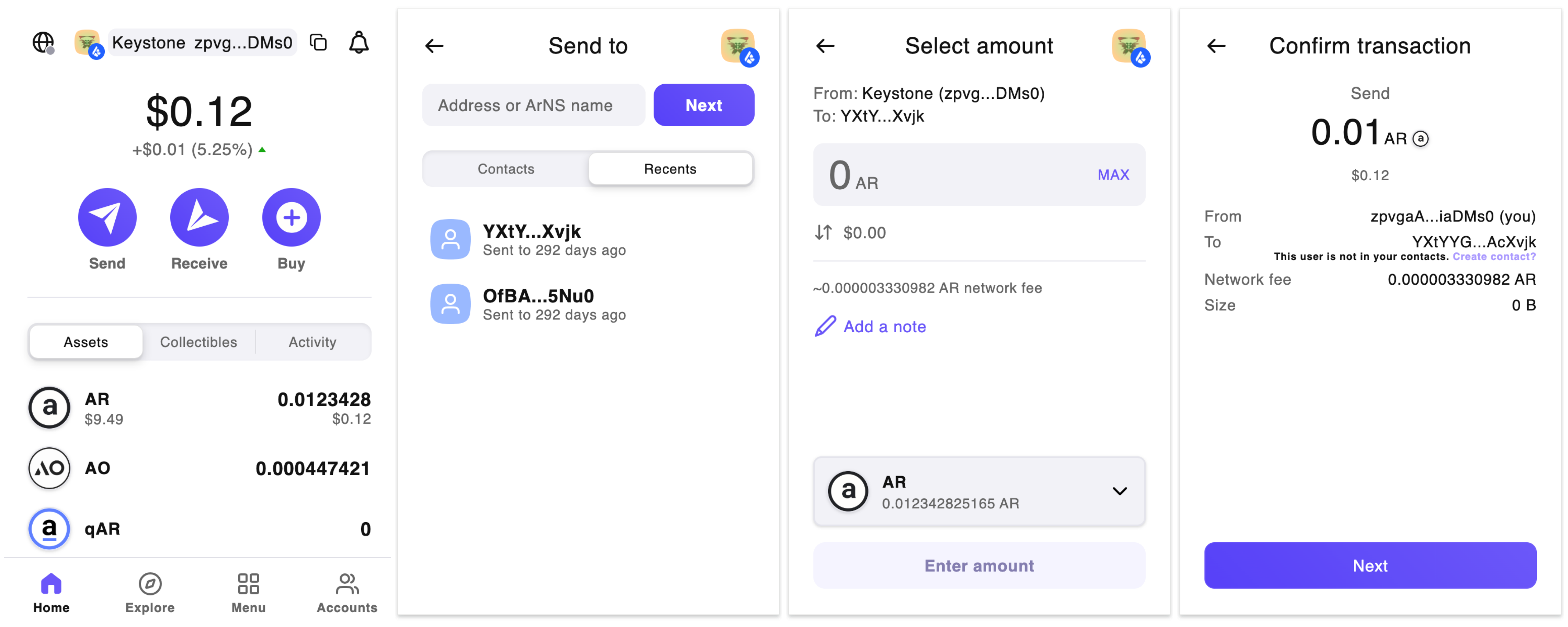 Enter the recipient’s address or the ArNS name.After verifying the address,tap ”Next”.