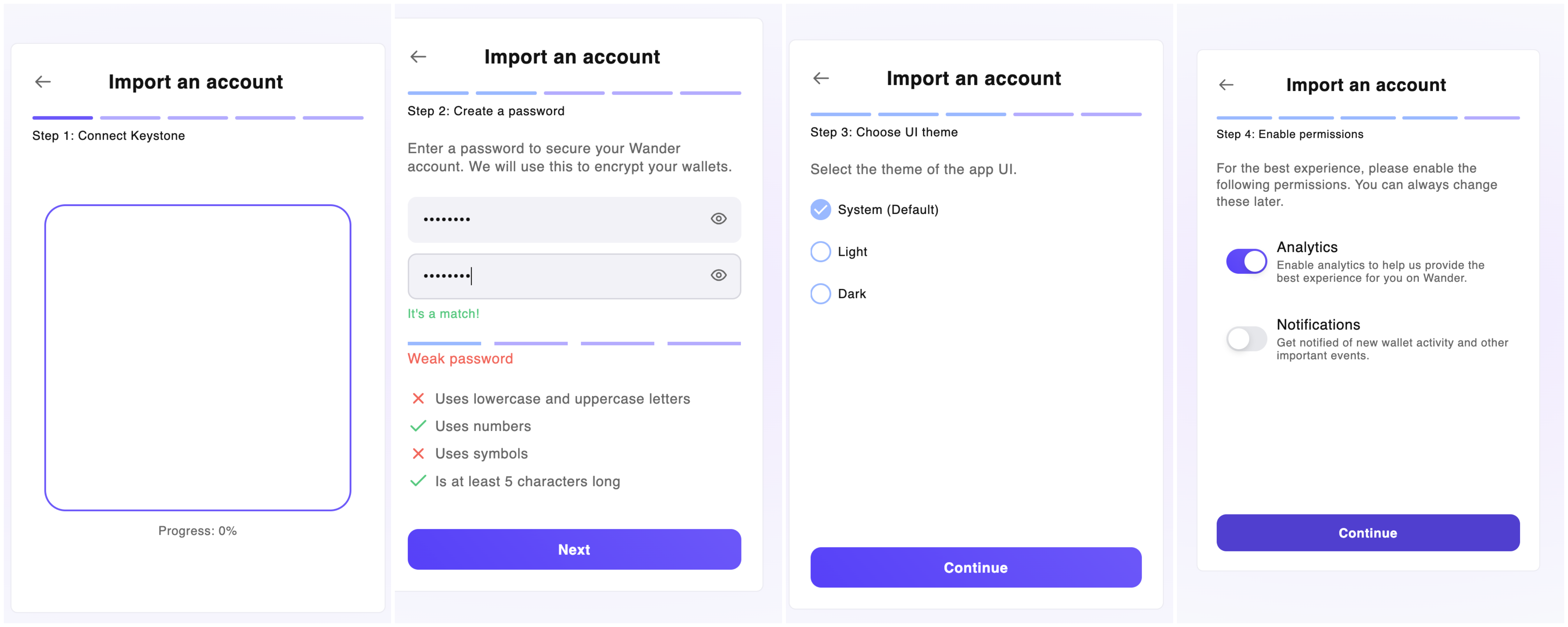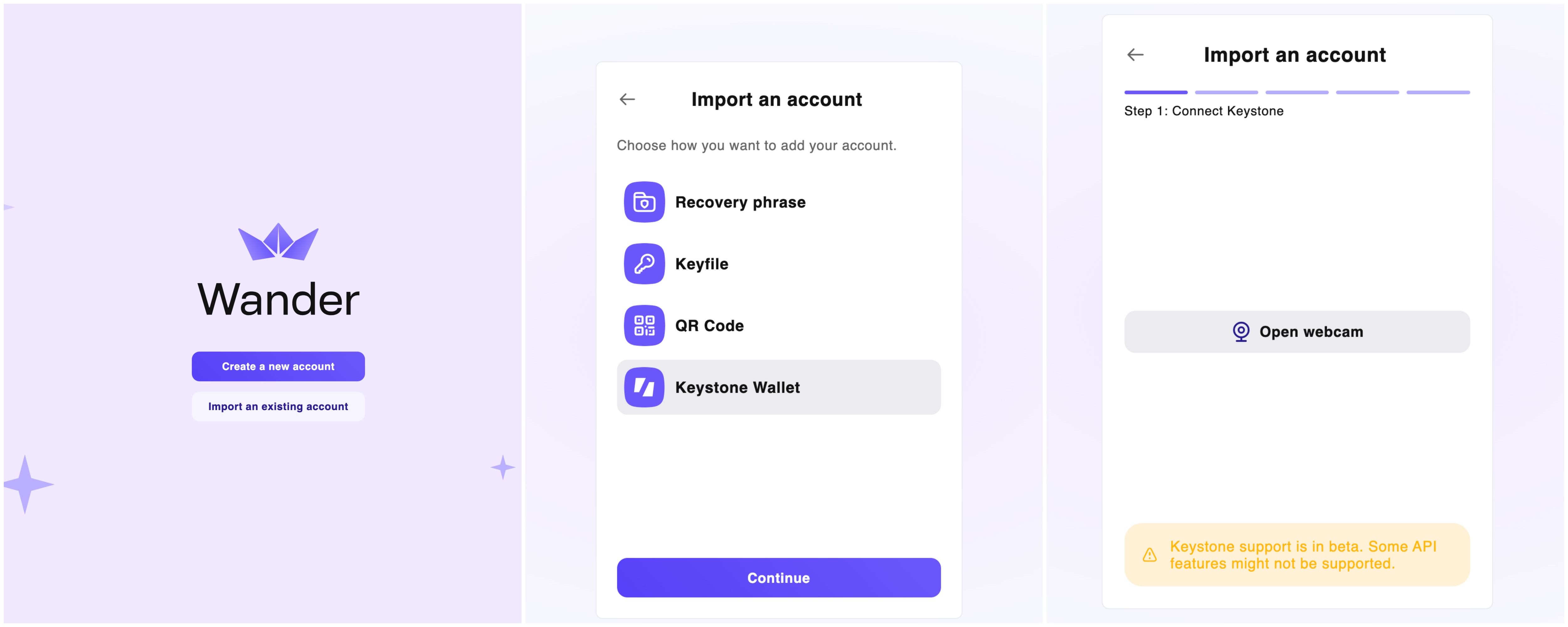 Launch the Wander Extension and select “Import an existing wallet”,then choose “Keystone Wallet”. and continue.