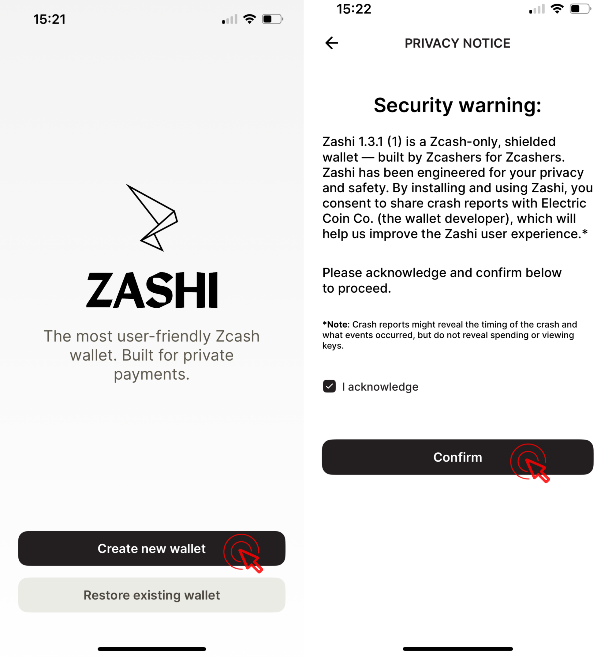 Click [Creat new wallet], review the “Security warning” and then select [I acknowledge] and click [Confirm].