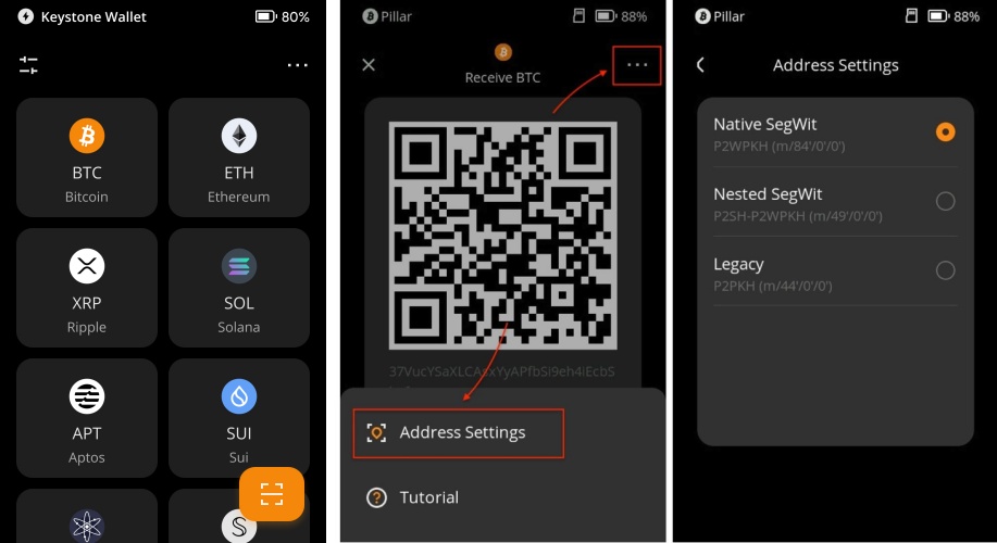 点击[地址设置]。您将看到三种BTC地址类型的选项。