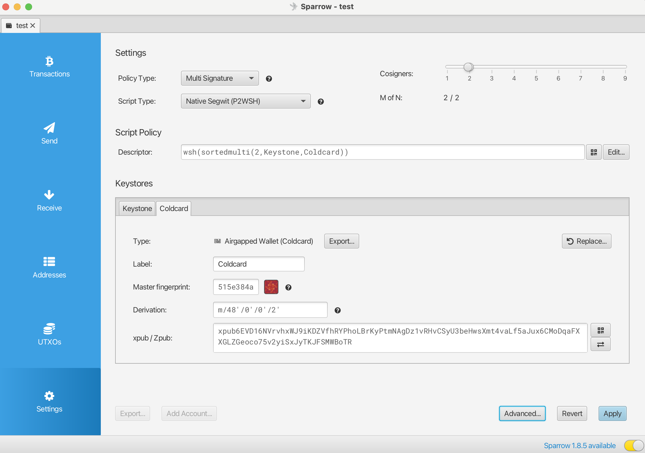 3. 在Sparrow上创建1个以Keystone、ColdCard作为多签方的2/2多签钱包: