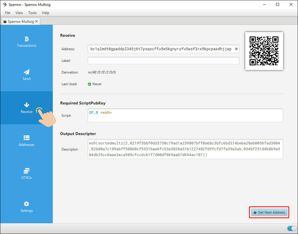 在 Sparrow 上,点击左侧的【Receive】,就会展示一个接收地址以及对应的二维码。