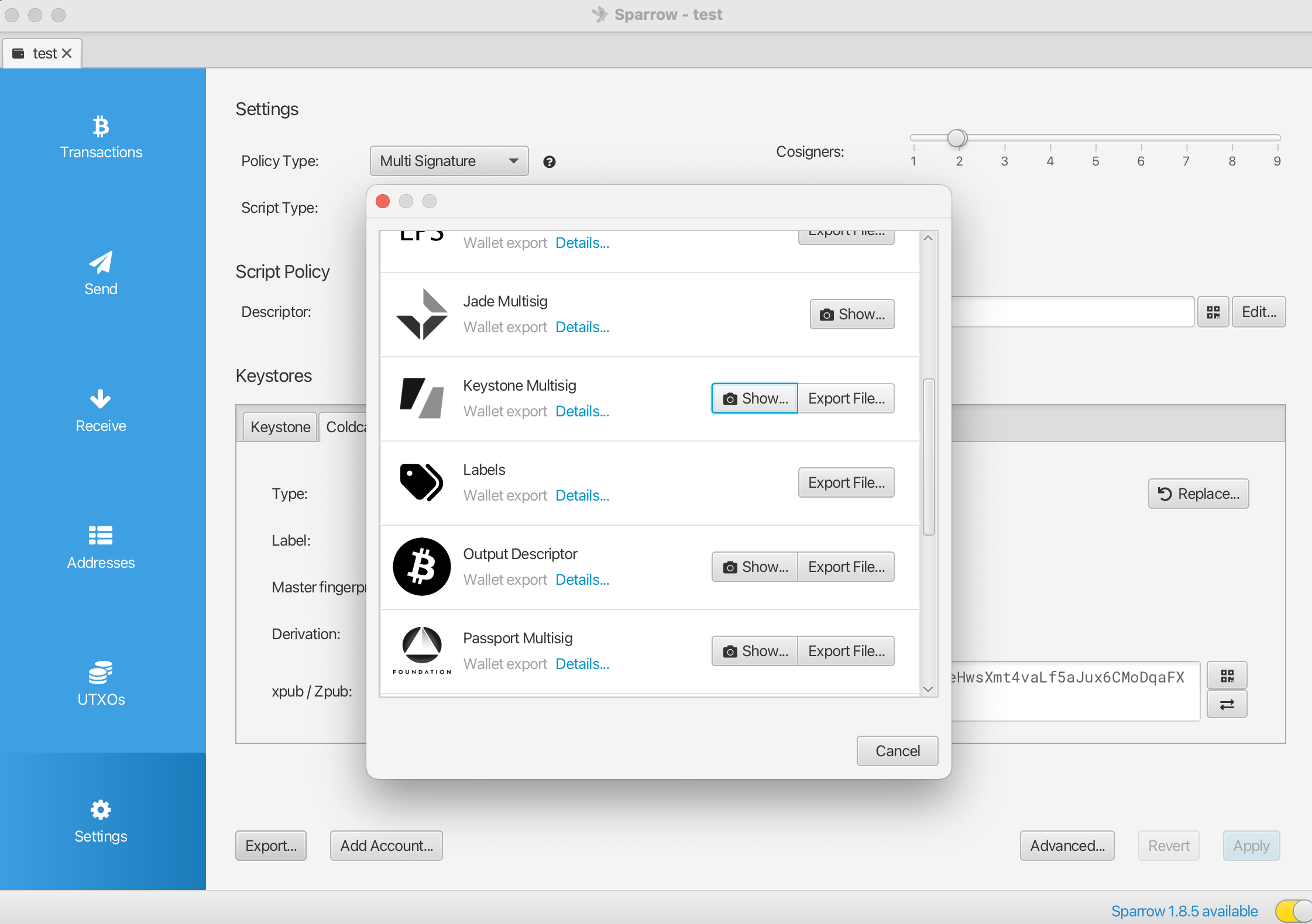 在【Settings】界面,点击左下角的【Export】,选择“Keystone Multi-sig”并选择“Show QR code”