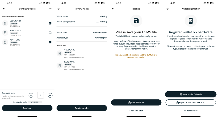 选择要作为多签参与方的两个密钥,并设置所需的签名数量。存储BSMS文件,选择I’ll do this later并且在下一步将多签钱包导入到Keystone 钱包设备。