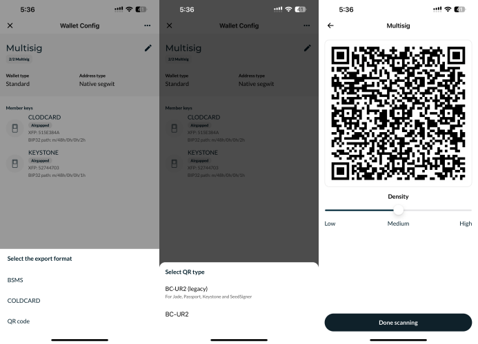 Nunchuk 端: 点击进入对应的多签钱包,点击【View wallet config】> 右上角【•••】图示>选择 QR code> 选择下方的BC-UR2(注意不是上方legacy版本的,那是二代版本)