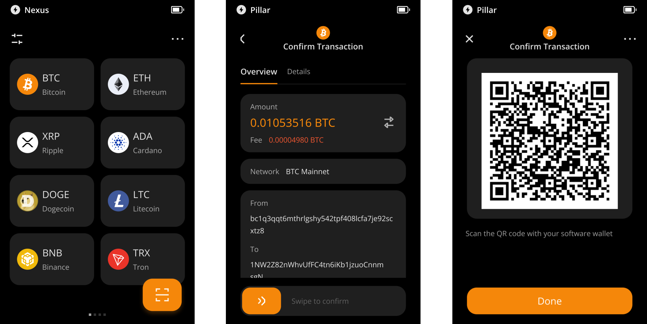 - 点击「发送」,扫描收款账户二维码或粘贴收款地址,输入交易金额;确认收款地址与金额后,页面将生成动态 PSBT 二维码,请使用您的 Keystone 设备完成签名。