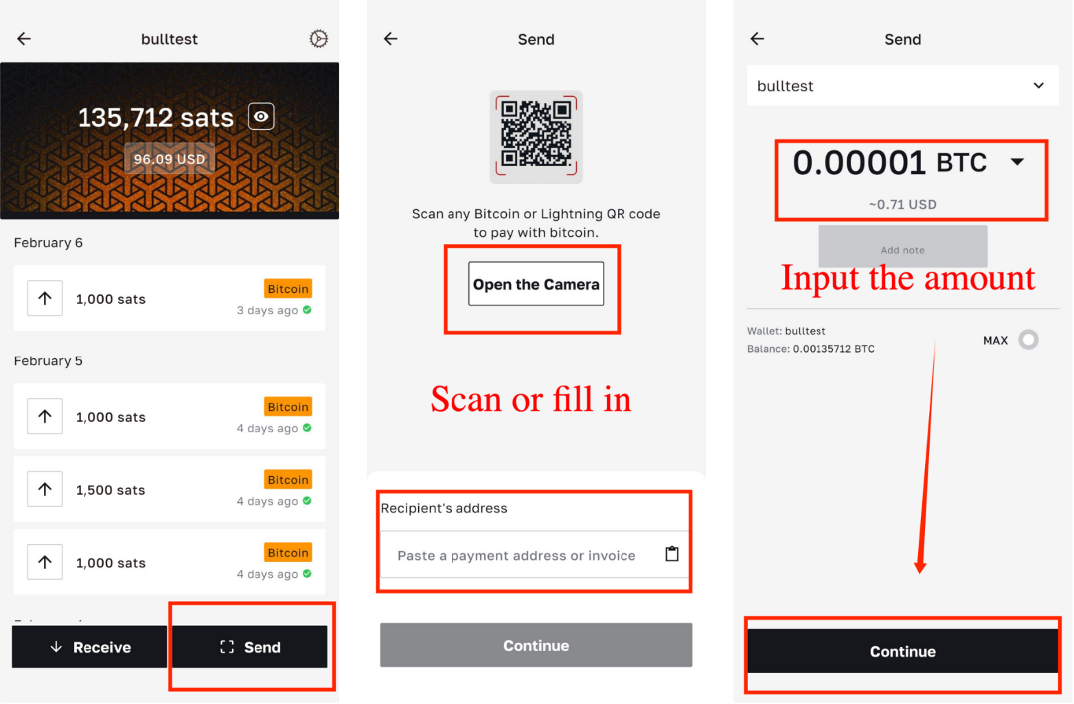 操作步骤:【Send】→【Open the Camera】/【Paste a payment address or invoice】→ Input the amount →【Continue】→【Show PSBT】→【I'm done】