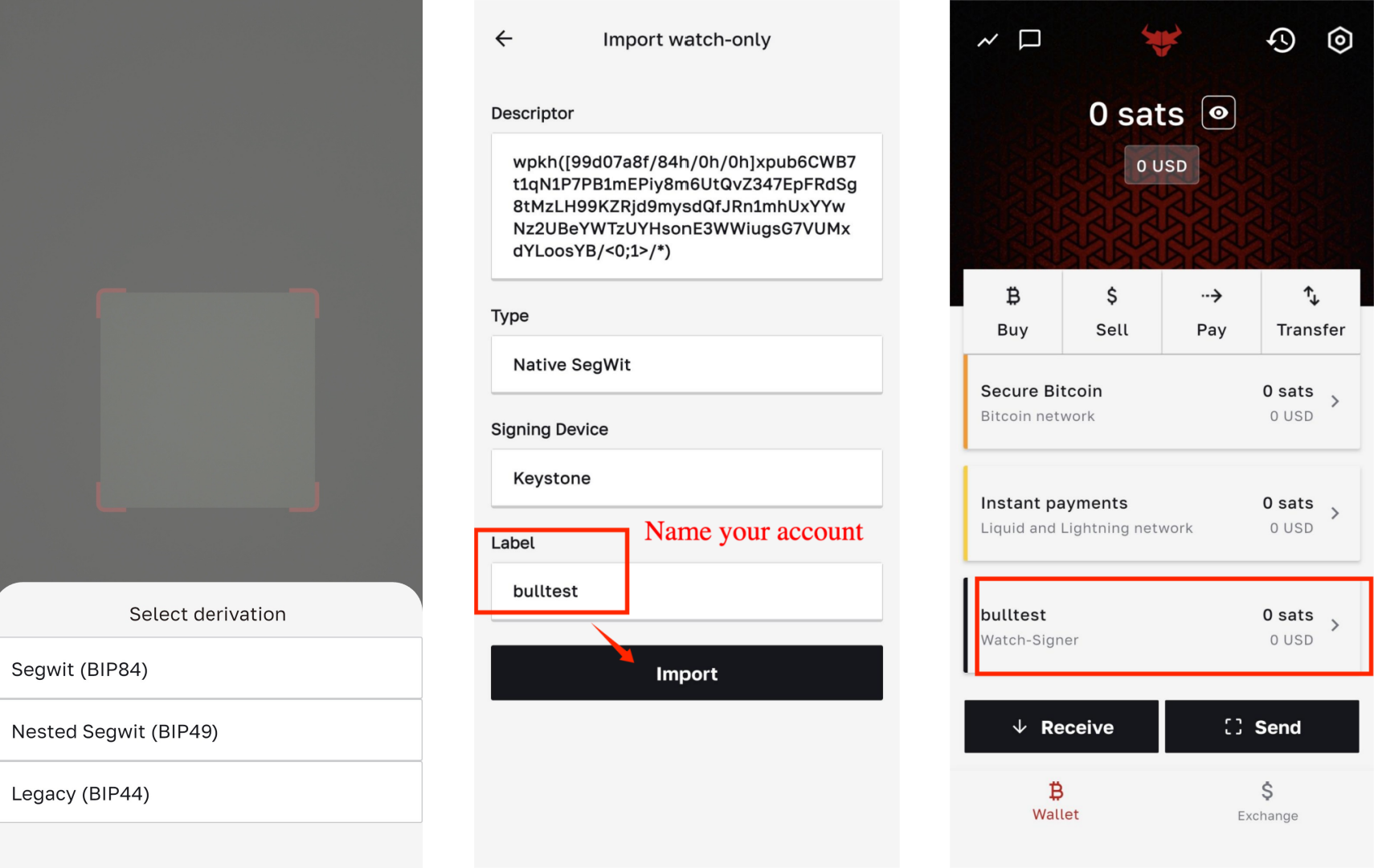 - 用 BULL 移动端扫描 Keystone 出现的二维码,在弹出界面选择地址派生路径,它决定着你的比特币地址格式和交易效率,选择派生路径后在【Label】为你的账户取名字,然后点击【Import】,账户创建成功!